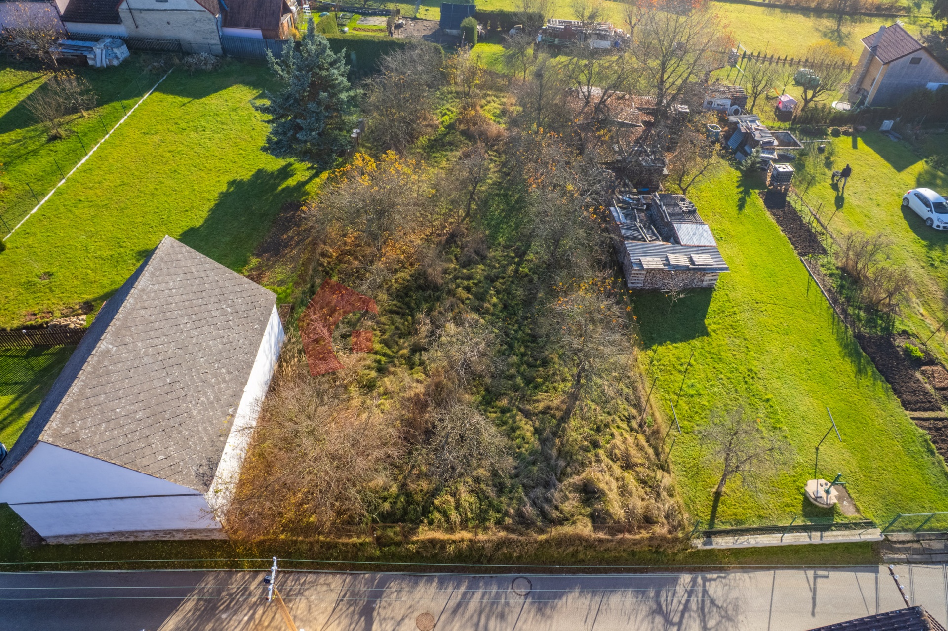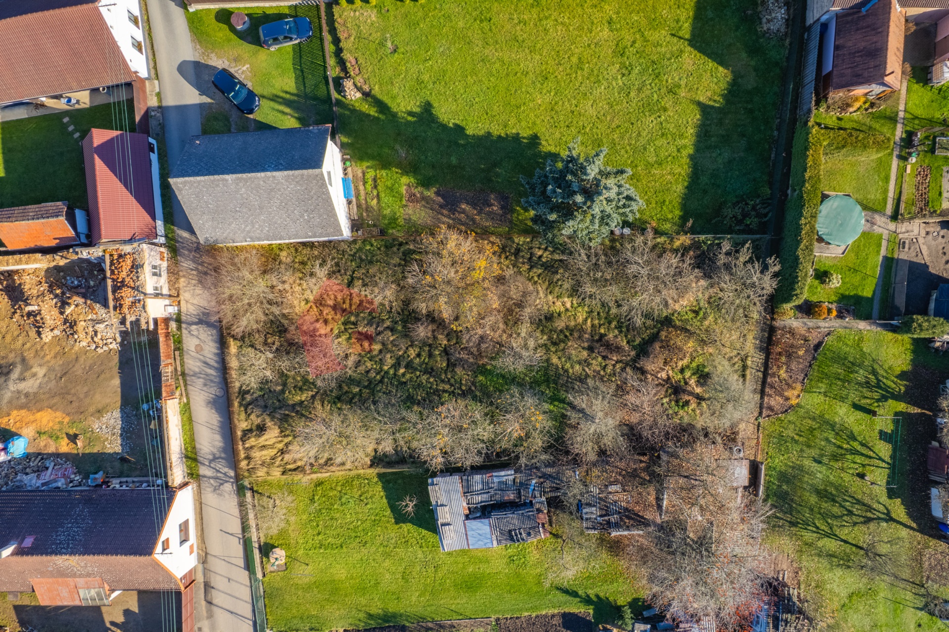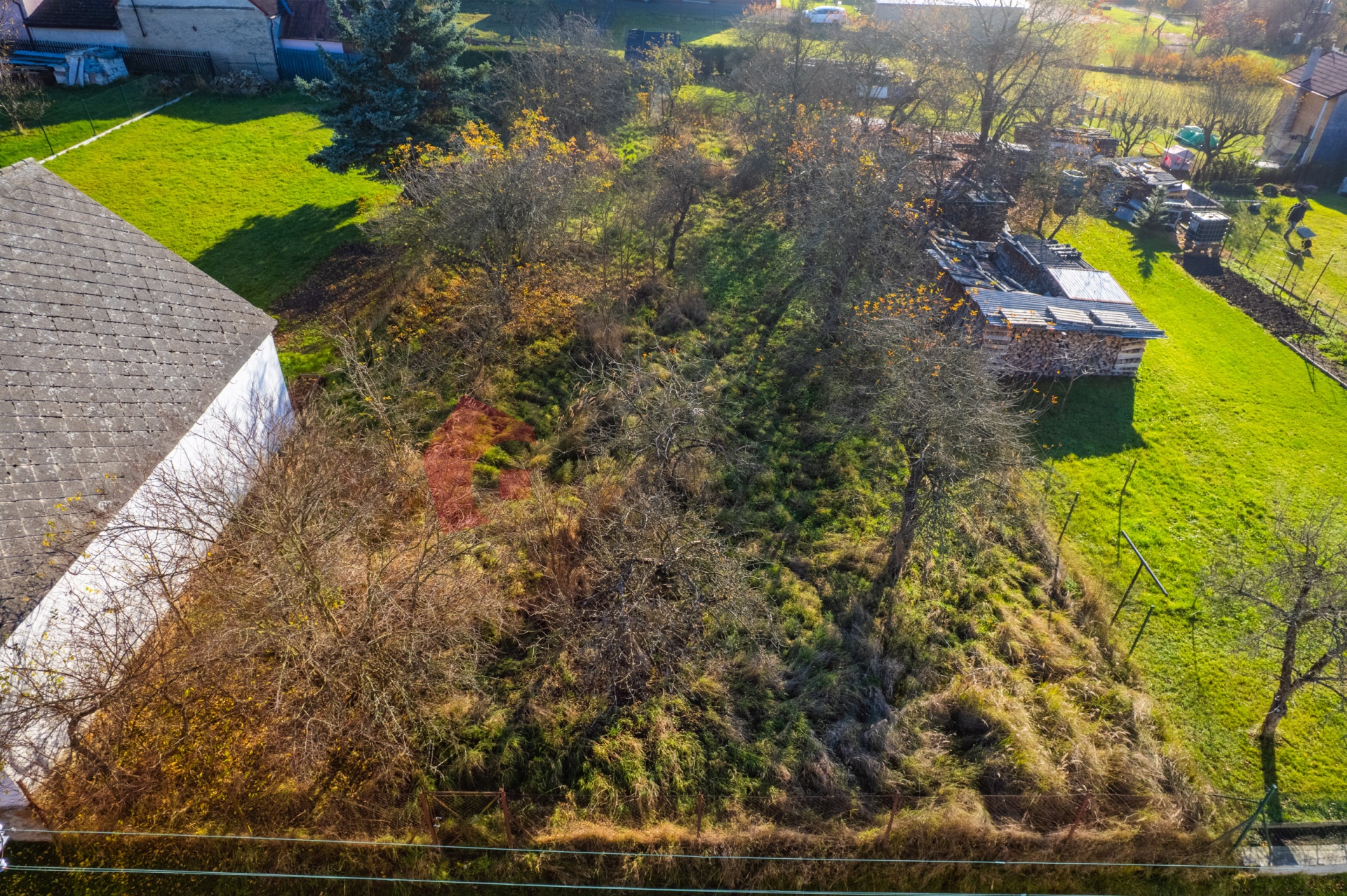 Pozemek je zatravněn s několika ovocnými stromy.