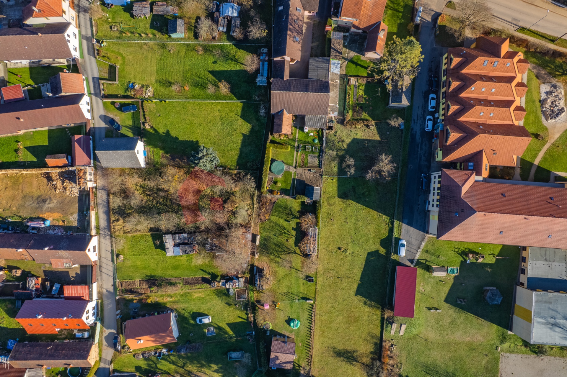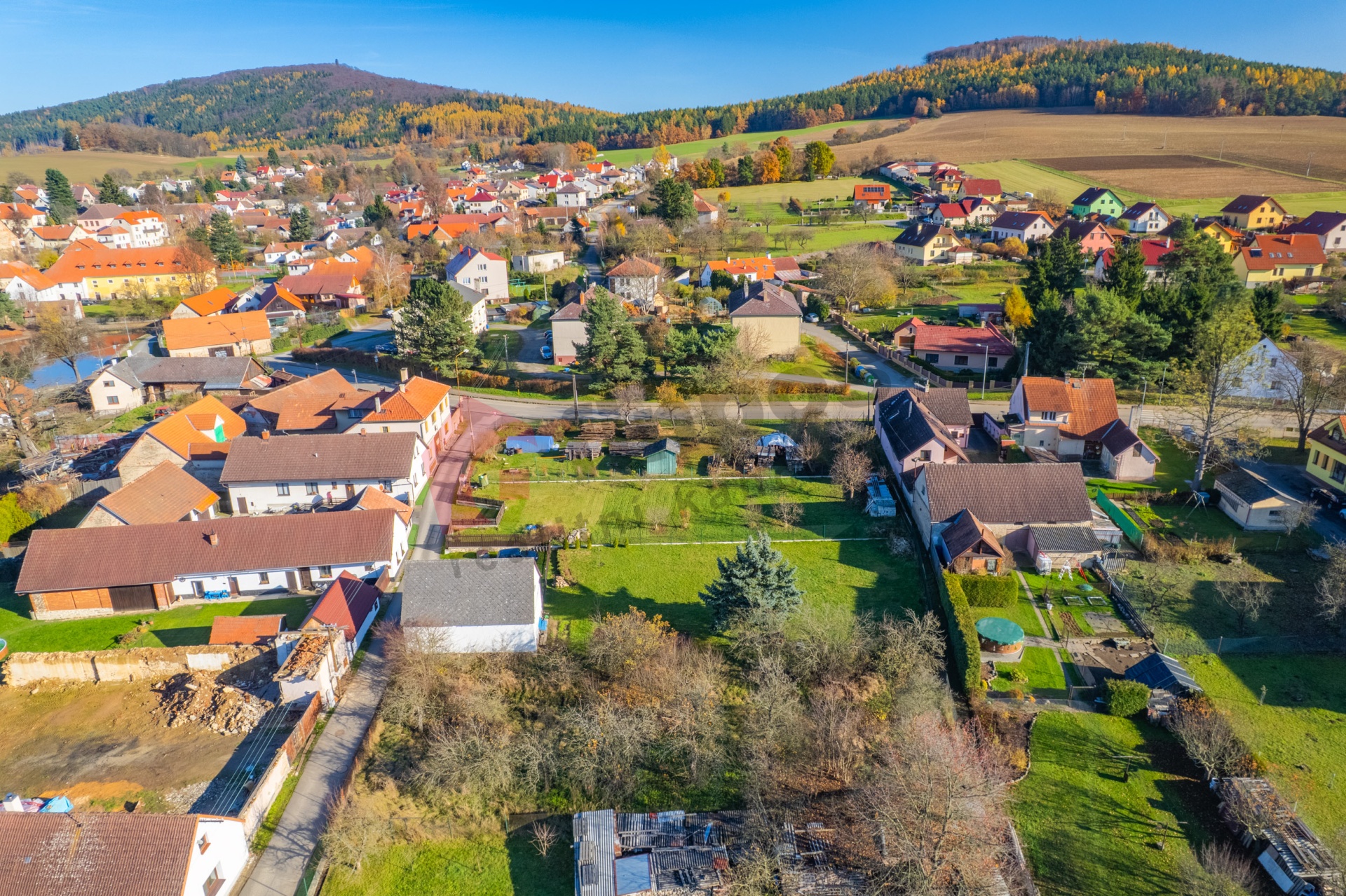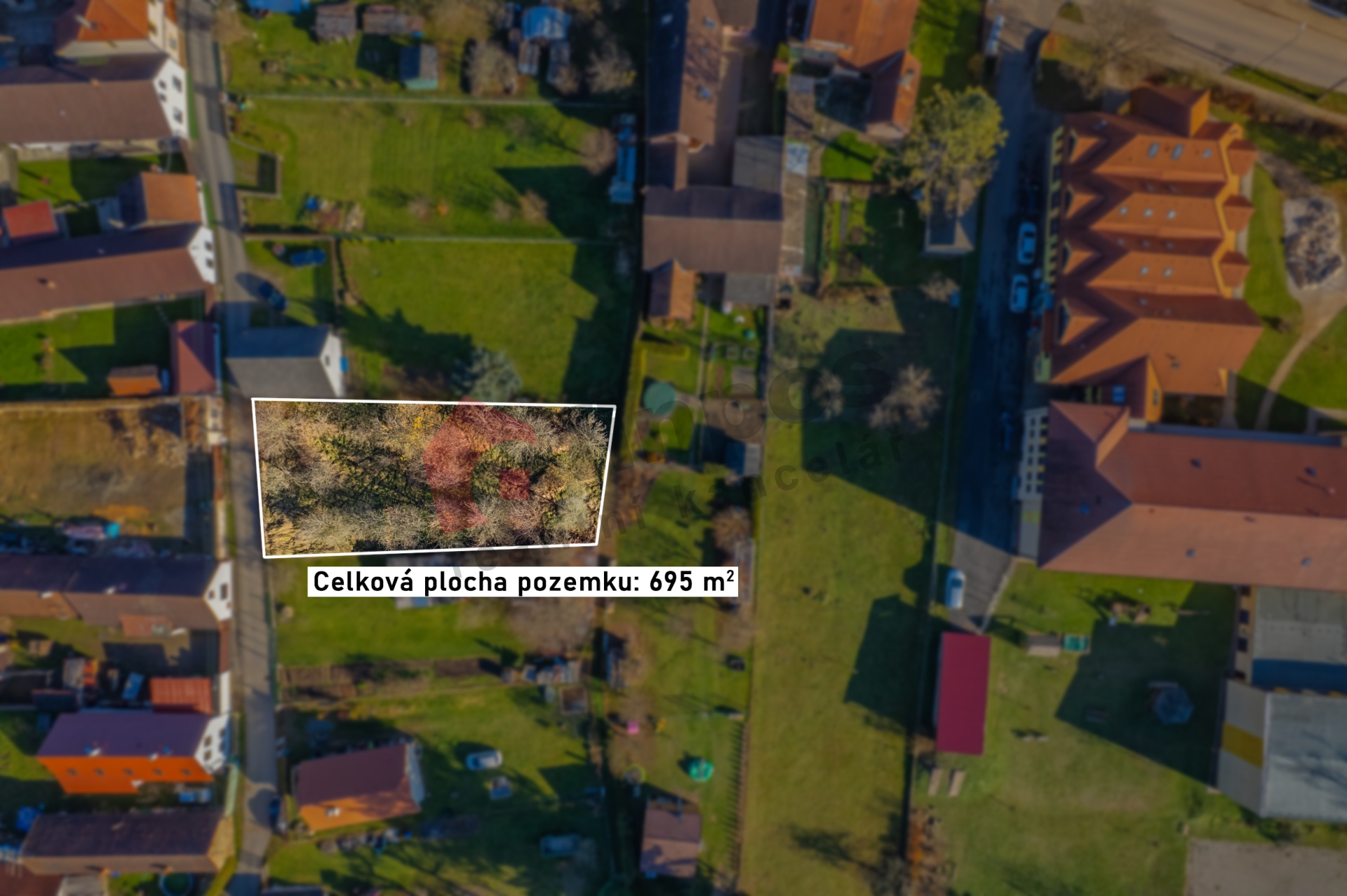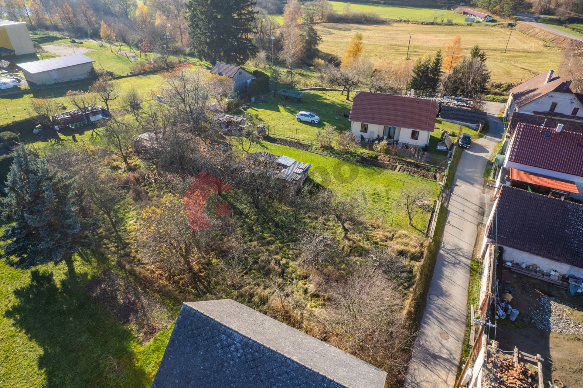 Pozemek je zatravněn s několika ovocnými stromy.