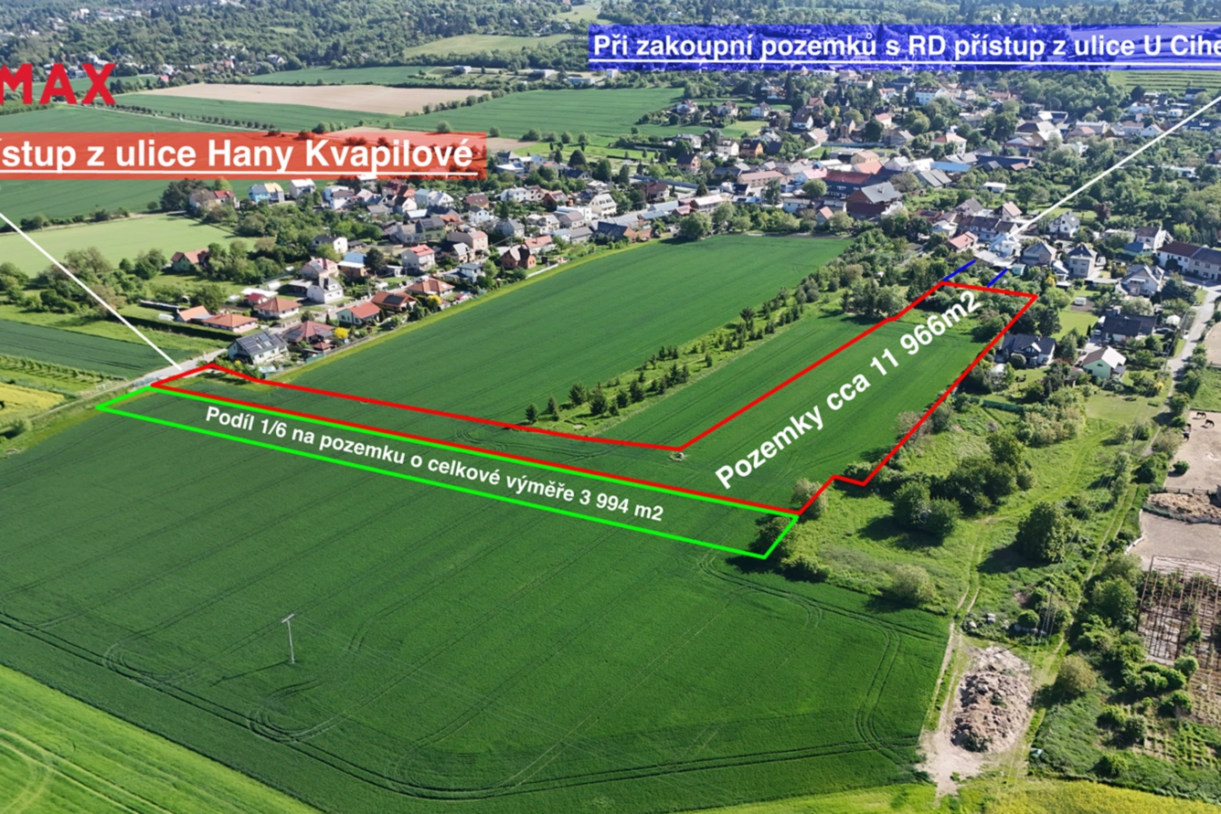 Nabízíme Vám výjimečnou investiční příležitost - soubor pozemků o celkové výměře cca 11 932m2 a podíl 1/6 (cca 665m2 ) na sousedním pozemku o celkové výměře 3 994 m2, tj. celkem cca 12 597 m2 v lukrativní a velmi žádané lokalitě městské části Olomouci - Droždíně, kde územním plánem jsou aktuálně vedeny některé části tohoto souboru pozemků k využití jako plochy zastavitelné a plochy přestavby smíšené obytné se strukturou zástavby jako blokový typ a z části je pozemek veden k využití jako plocha zastavitelná s využitím plochy veřejných prostranství a dále plocha zemědělská s poznámkou uzemní rezerva označena UR-23. Přístup na pozemky je zajištěn z ulice Hany Kvapilové z veřejné komunikace ve vlastnictví města Olomouce. Pozemek se nachází v klidné lokalitě, městské části Olomouc - Droždín s velmi dobrou dopravní dostupností do centra města. V současnosti je na část tohoto pozemku uzavřena nájemní smlouva se zemědělským družstvem, kterou je možné dle podmínek z ní vyplývajících vypovědět. V pozemku parc. č. 221/43 je vedena kanalizace ve vlastnictví města Olomouce. K tomuto souboru pozemků je možné také dokoupit další pozemky včetně rodinného domu (Viz samostatný inzerát s přístupem z ulice U cihelny) a zázemí bývalé cukrářské výrobny, taktéž vedeny jako plochy smíšené obytné. Zakoupením celku včetně pozemků s rodinným domem jsou zajištěny dva přístupy, jeden z ulice U Cihelny a druhý z ulice Hany Kvapilové. Ke geometrickému dělení pozemku parc.č. 264 dojde dle požadavku prodávajících v okamžiku nalezení vážného zájemce o tento soubor pozemků.