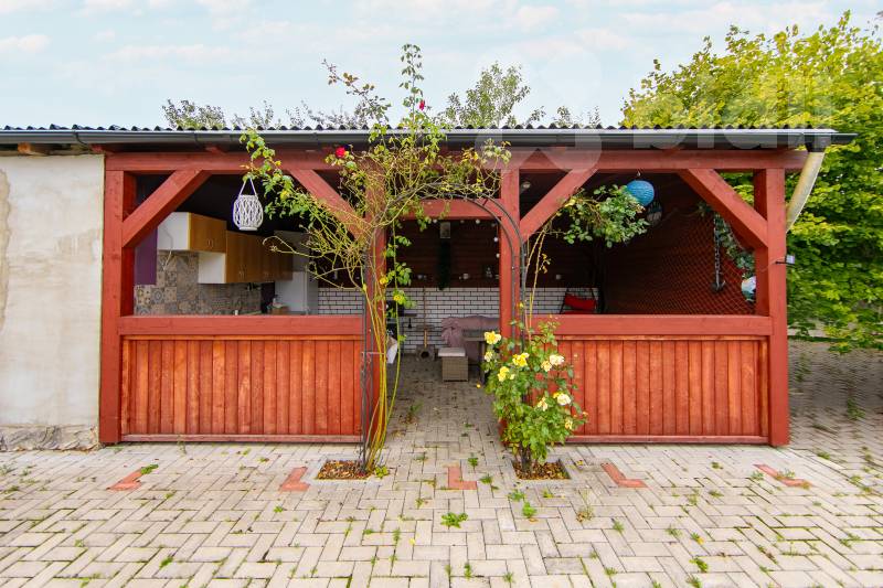 Na garáž navazuje krásně řešená prostorná pergola. Pergola má také elektrické připojení na 220V.