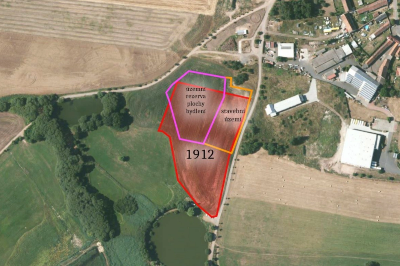 Parcela leží na jihozápadě obce. Ze své severní strany leží v ploše označené jako zastavitelná plocha smíšená - v prodeji se jedná asi o 244 m2. Současně leží v ploše, kterou obec rezervovala pro plochu bydlení - cca 590 m2. Uspořádání je k náhledu ve fotogalerii inzerce. Pozemek samotný je zobrazen červenou barvou, zastavitelné plochy růžovou respektive oranžovou, jak odpovídají zákresu v územním plánu obce.