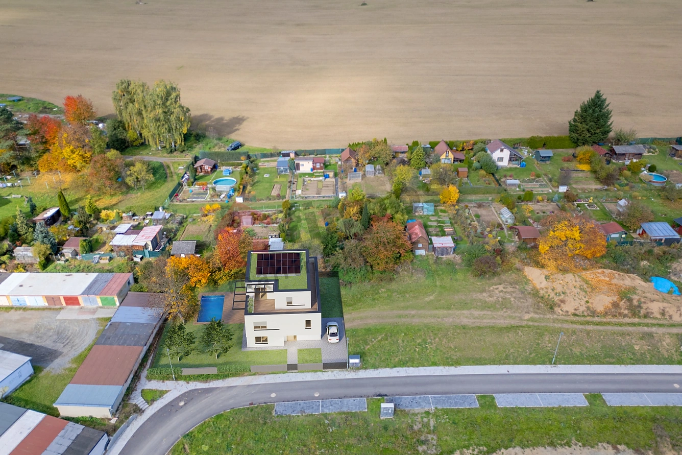 Pozemek je plně připraven pro výstavbu s dostupnou elektřinou (230V, 400V), dálkovým vodovodem a veřejnou kanalizací. Podle územního plánu zde můžete postavit rodinné domy, dvojdomy či řadové domy. Maximální výška zástavby povolená v této oblasti činí 3 nadzemní podlaží, což umožňuje kreativní architektonická řešení - viz vizualizace. Maximální zastavěná plocha je 25% pro soliterní RD, 50% pro řadový RD a 35% pro dvojdomek; plocha zeleně je vždy minimálně 40% plochy pozemku.
