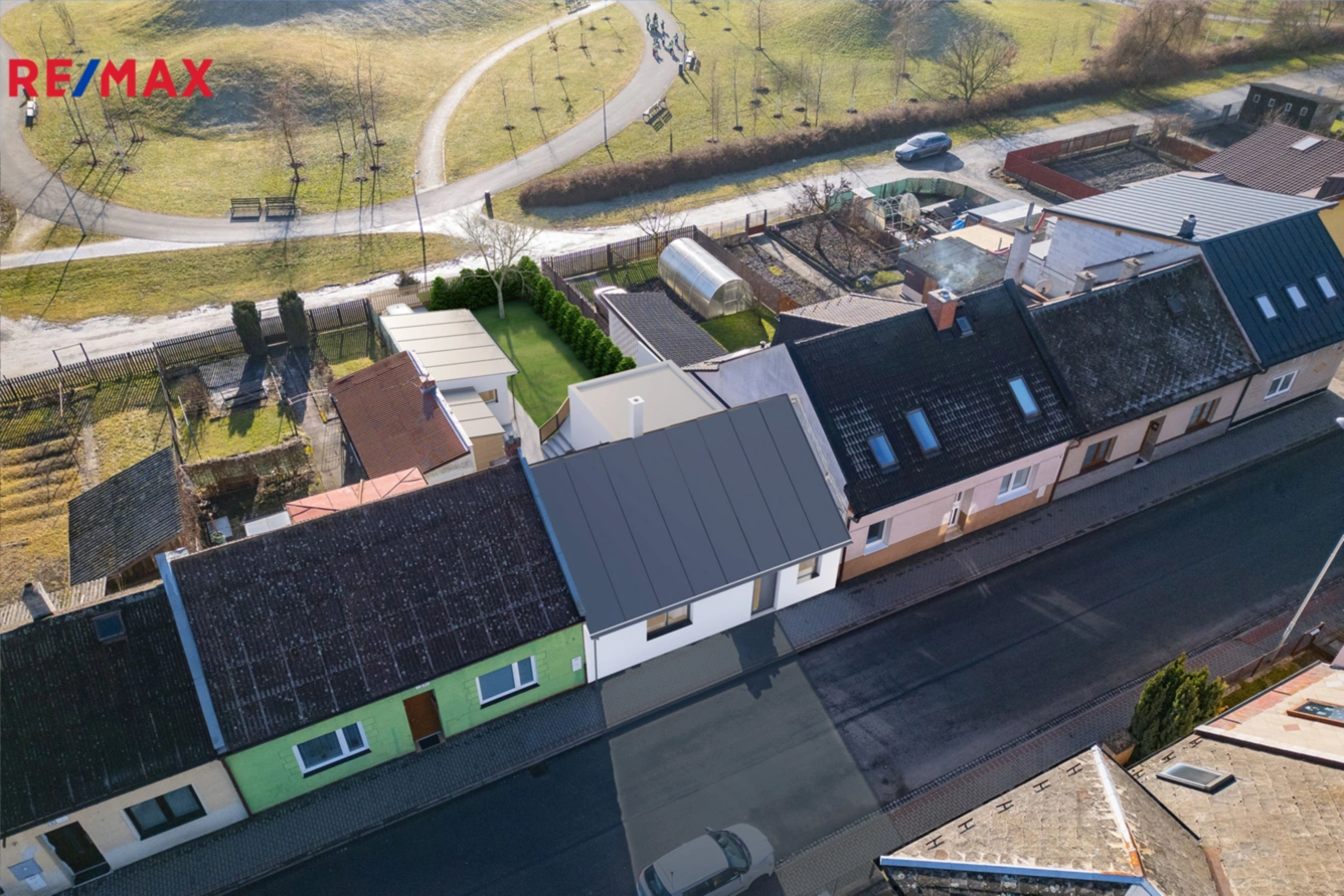 Půdorys domu ve tvaru L má rozměry 9,8 x 12x8 m. Řešený dům je jednopodlažní, řadový, nepodsklepený objekt o dispozici 3+1 nebo 3+kk se dvěma koupelnami a dvěma WC (jedním samostatným).