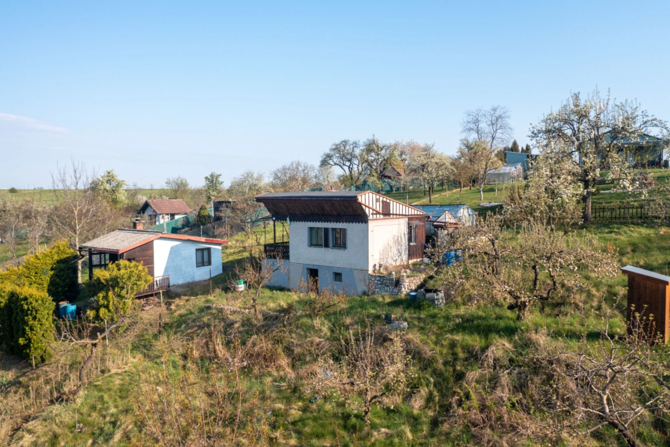 Zahrada se nachází ve svahu a chata je zasazena na jeho vrcholu, což zajišťuje krásný výhled i příjemné soukromí. Objekt je podsklepený, součástí je skleník a tradiční kadibudka se srdíčkem.