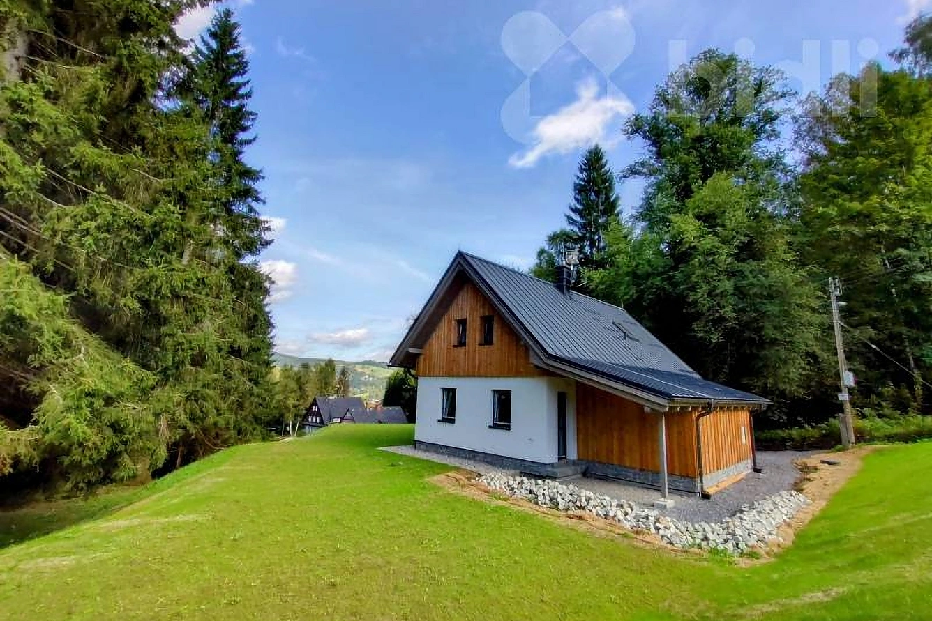 Nabízíme stylový horský dům s garáží a krytou terasou na krásném pozemku s lesním potokem.Dispozice 4+kk, 2 x koupelna.
