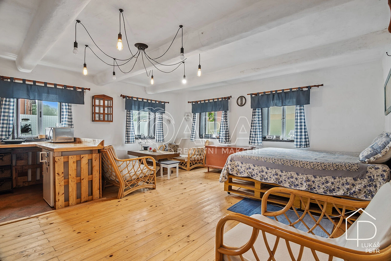 Chalupa stojí na pozemku s výměrou 720 m2 a nabízí dispozici 6+1.