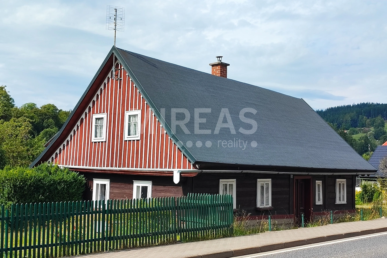 Nabízíme Vám k prodeji chalupu 1+1/70 m2 s obytnou stodolou 1+kk/30m2 v obci Jablonec nad Jizerou, okres Semily. Dřevěná, částečně podsklepená roubená chalupa se sedlovou střechou z roku 1915, se nachází u silnice. Dispozičně má dům vstupní předsíň, kam se vchází vchodem z boku, odtud vedou dveře do dílny, na WC, a druhé do centrální chodby s dřevěným schodištěm na půdu. Z této chodby se pak dostaneme do dalších místností - kuchyně, pokoj, koupelna se sprchovým koutem a bojlerem. Podlahy jsou prkenné, částečně betonové. Okna původní dřevěná. Roubenka se smíšeným základem (cihla, kámen) nyní prochází sanací. Vytápění kamny na tuhá paliva, ohřev vody bojlerem.