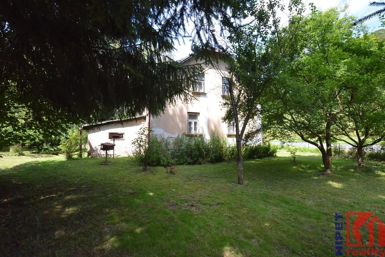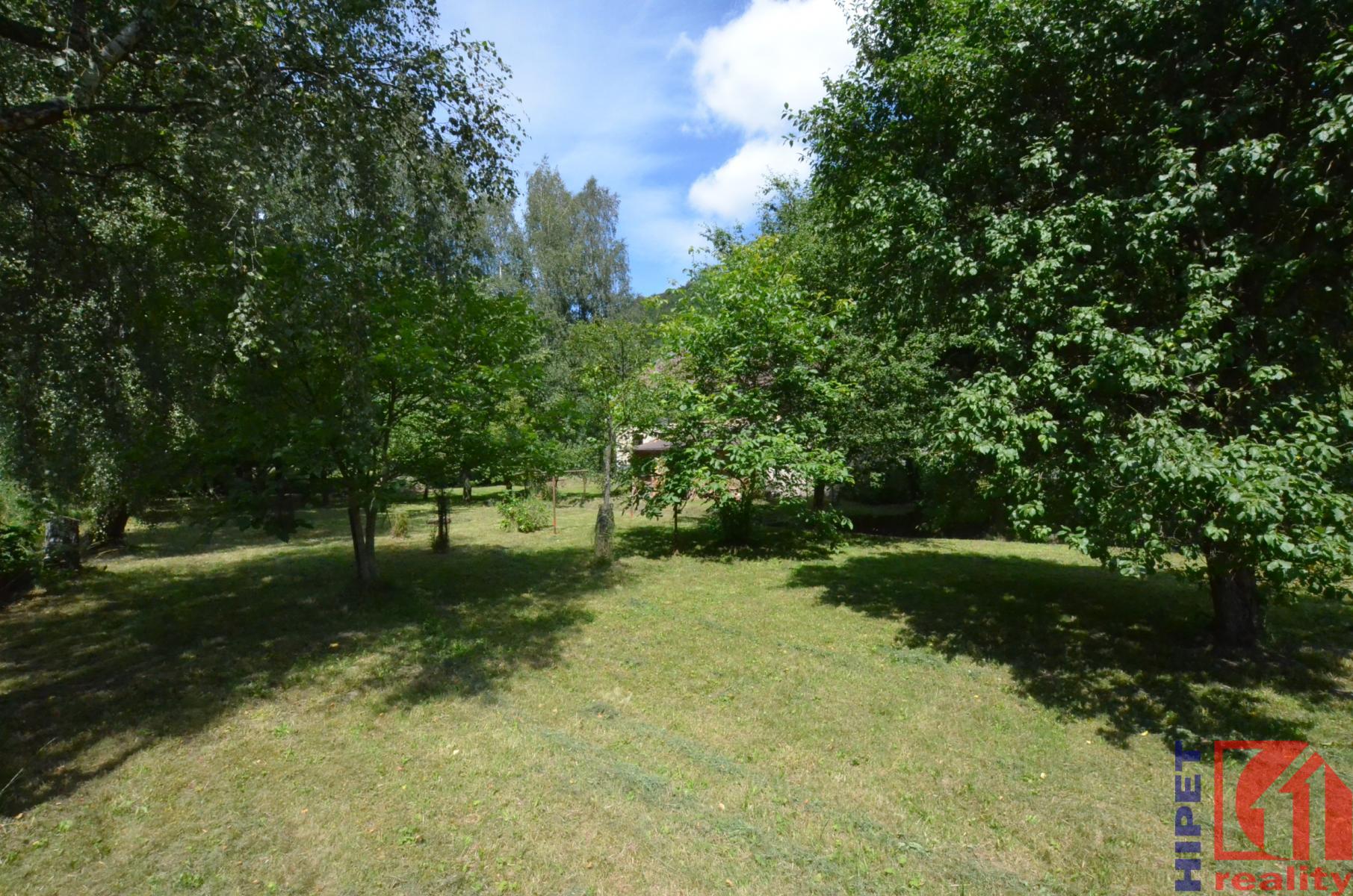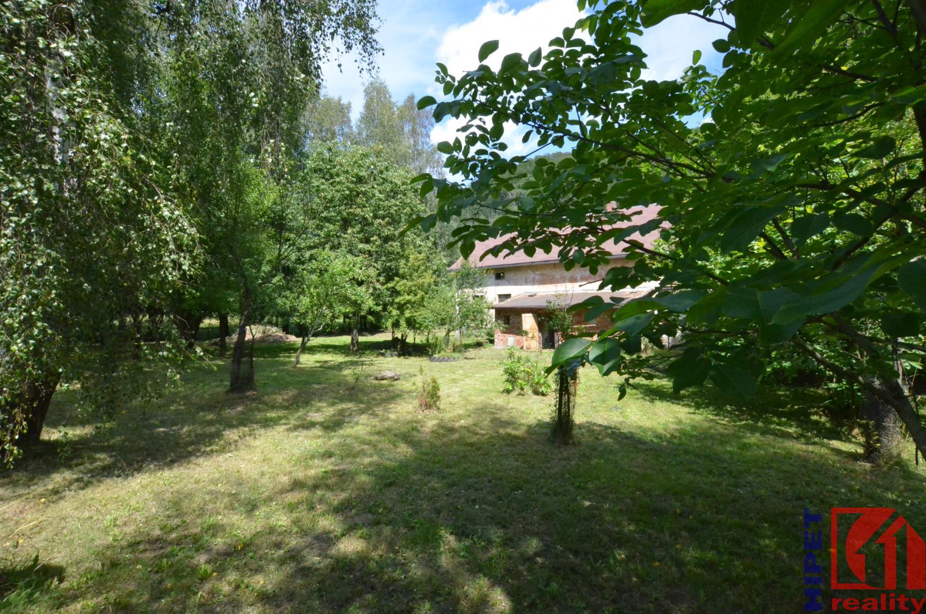 Prostorná zahrada se vzrostlými ovocnými a okrasnými stromy a potůčkem na okraji pozemku