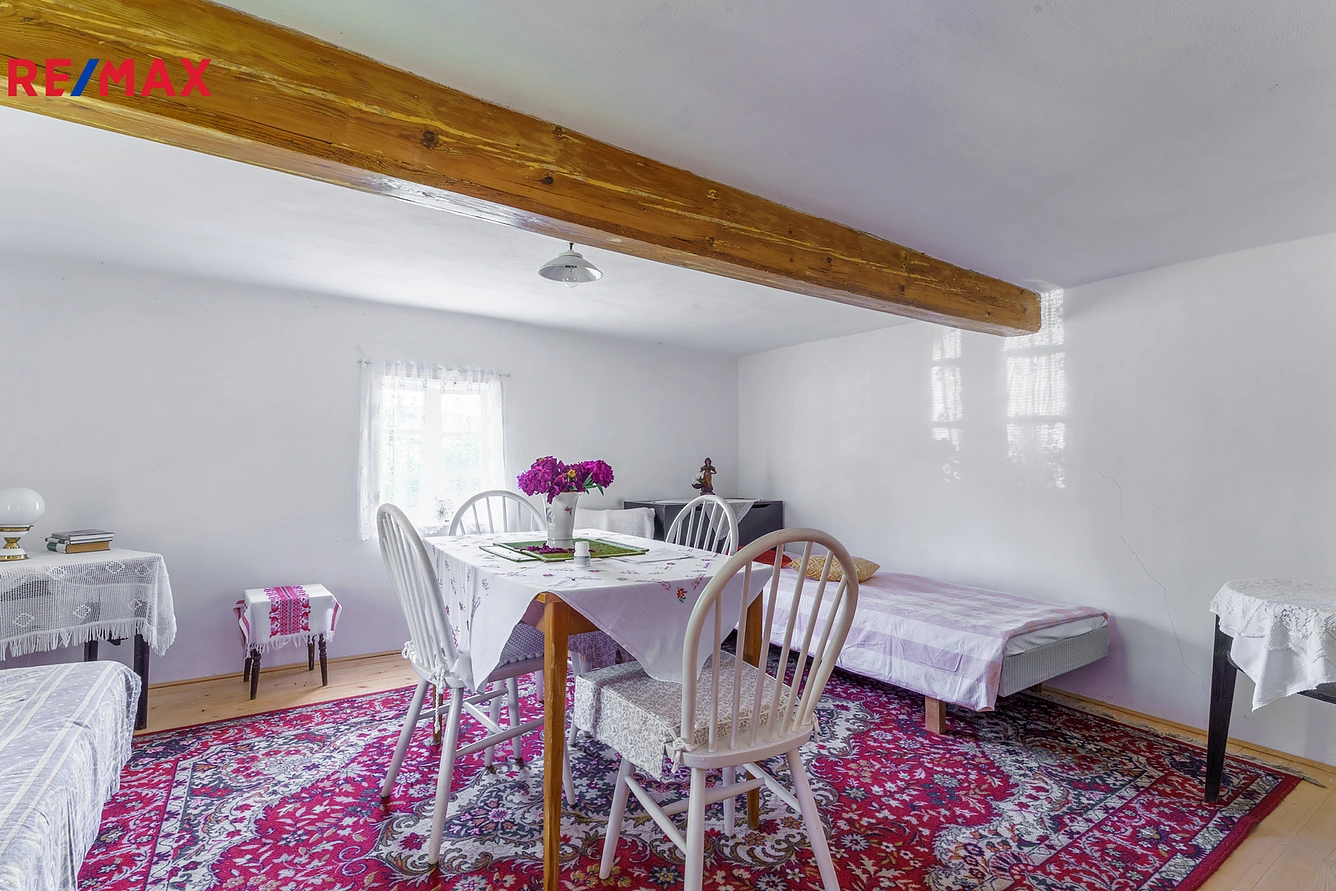 Dispozice: Roubenka má 2 pokoje včetně kuchyňského koutu. V horním patře je vytvořený spací pokoj, dole najdete vejminek a zbytek tvoří rozlehlá stodola.