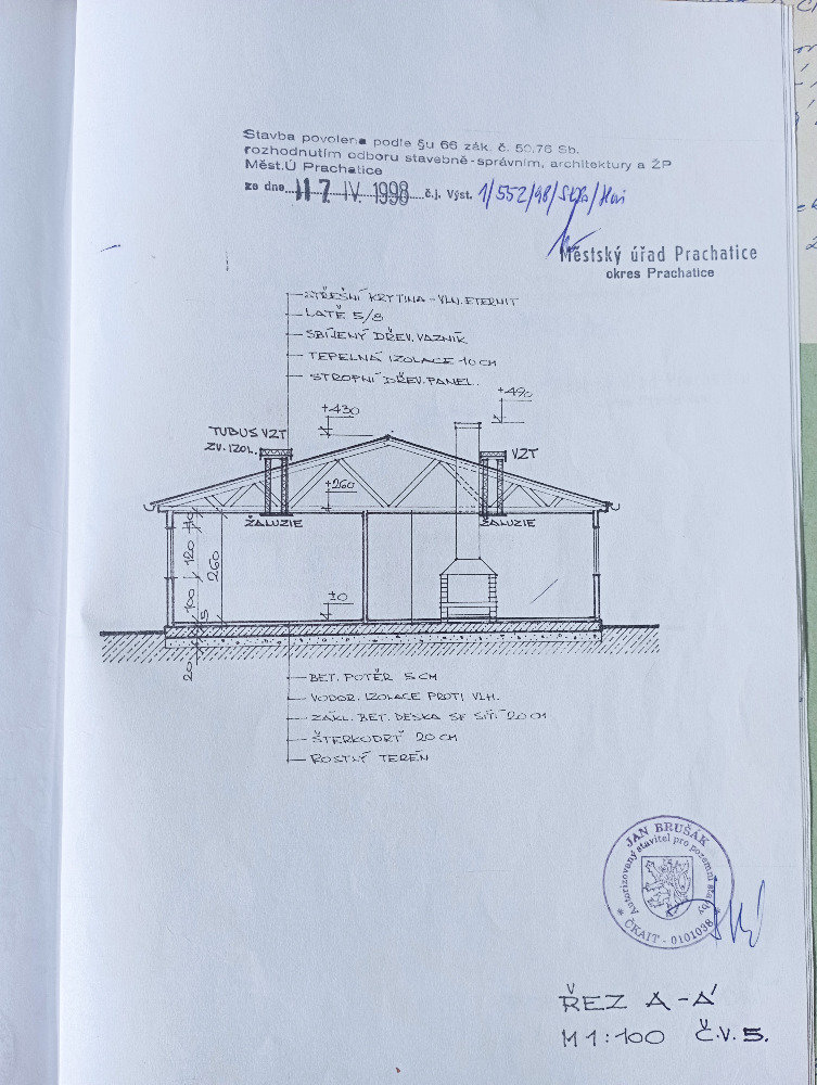 Nemovitost tvoří hlavní dřevěný objekt zkolaudovaný jako provozovna (v minulosti sloužil jako víkendová restaurace s diskotékami). Výměra objektu je 182 m2. Objekt má jedno nadzemní podlaží se sedlovou střechou a tvoří ho velký sál s výčepem a krbem, malou letní kuchyňkou, sociálním zařízením (samostatné WC muži a WC ženy) a obytnou částí s celkem čtyřmi samostatnými obytnými místnostmi (dispozice 4+kk, s koupelnou se sprchovým koutem a WC). Obytné místnosti jsou zatepleny a čtyři okna jsou vyměněna za nová plastová s roletami, plastové terasové dveře s roletou a vstupem na boční menší terasu. Ostatní okna jsou původní dřevěná. Vytápění obytné části je řešeno akumulačními kamny, ohřev TUV el. bojlerem, do objektu je přiveden městský vodovod, elektřina 230/400 V, odpady jsou svedeny do městské kanalizace a poté do čističky. Plyn k dispozici není.