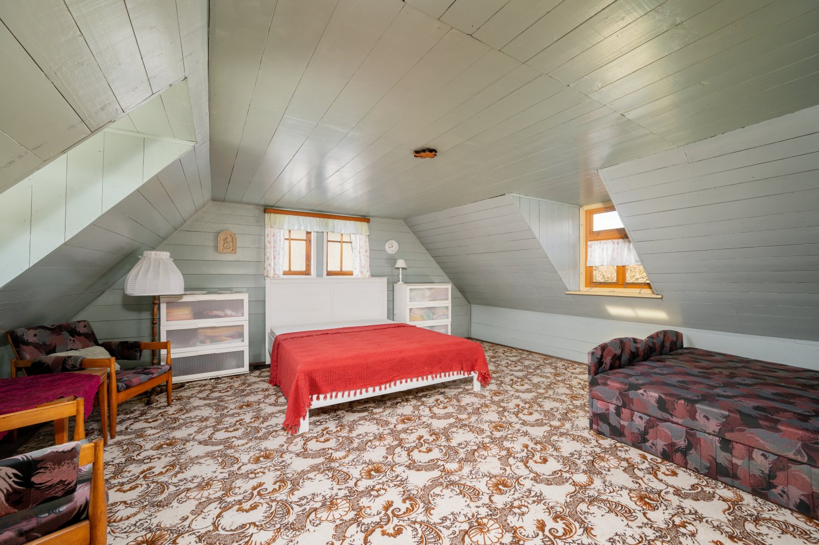2. NP (Podkroví – cca 85 m²): Patro nabízí velkorysé ložnice: hlavní pokoj (28,0 m²) a druhý pokoj (23,5 m²). Půdní prostor nad garáží (23,9 m²) - tato část je stavebně připravena k vestavbě – nabízí se zde vybudování ateliéru, herny nebo samostatného apartmánu pro hosty.