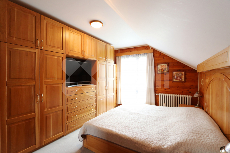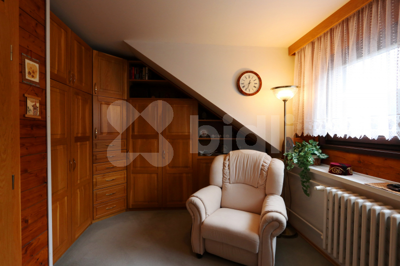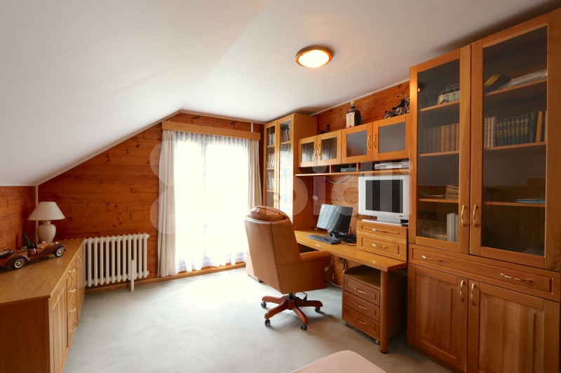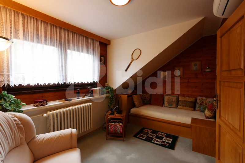 V mezipatře je další pokoj se sníženým stropem, například pro přespání dvou dospělých nebo až čtyř dětí.