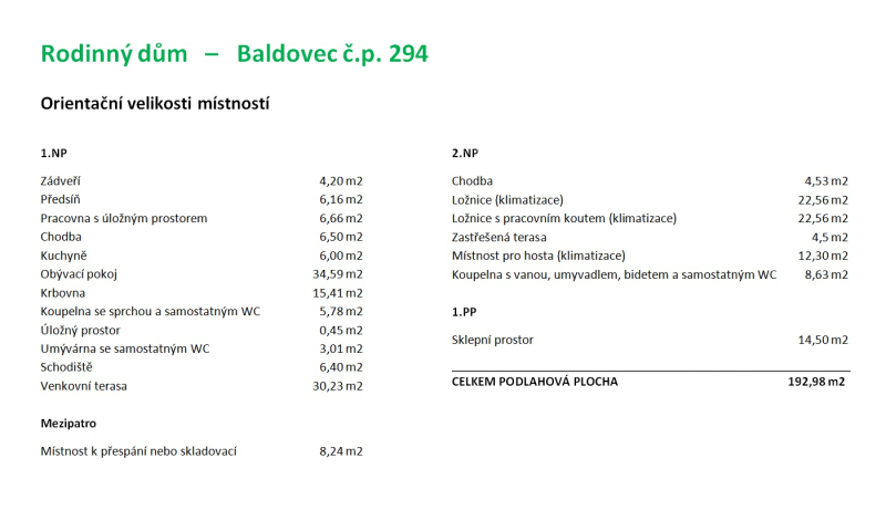 Zádveří 4,20 m2, Předsíň 6,16 m2, Pracovna s úložným prostorem 6,66 m2, Chodba 6,50 m2, Kuchyně 6,00 m2, Obývací pokoj 34,59 m2, Krbovna 15,41 m2, Koupelna se sprchou a samostatným WC 5,78 m2, Úložný prostor 0,45 m2, Umývárna se samostatným WC 3,01 m2, Schodiště 6,40 m2, Venkovní terasa 30,23 m2