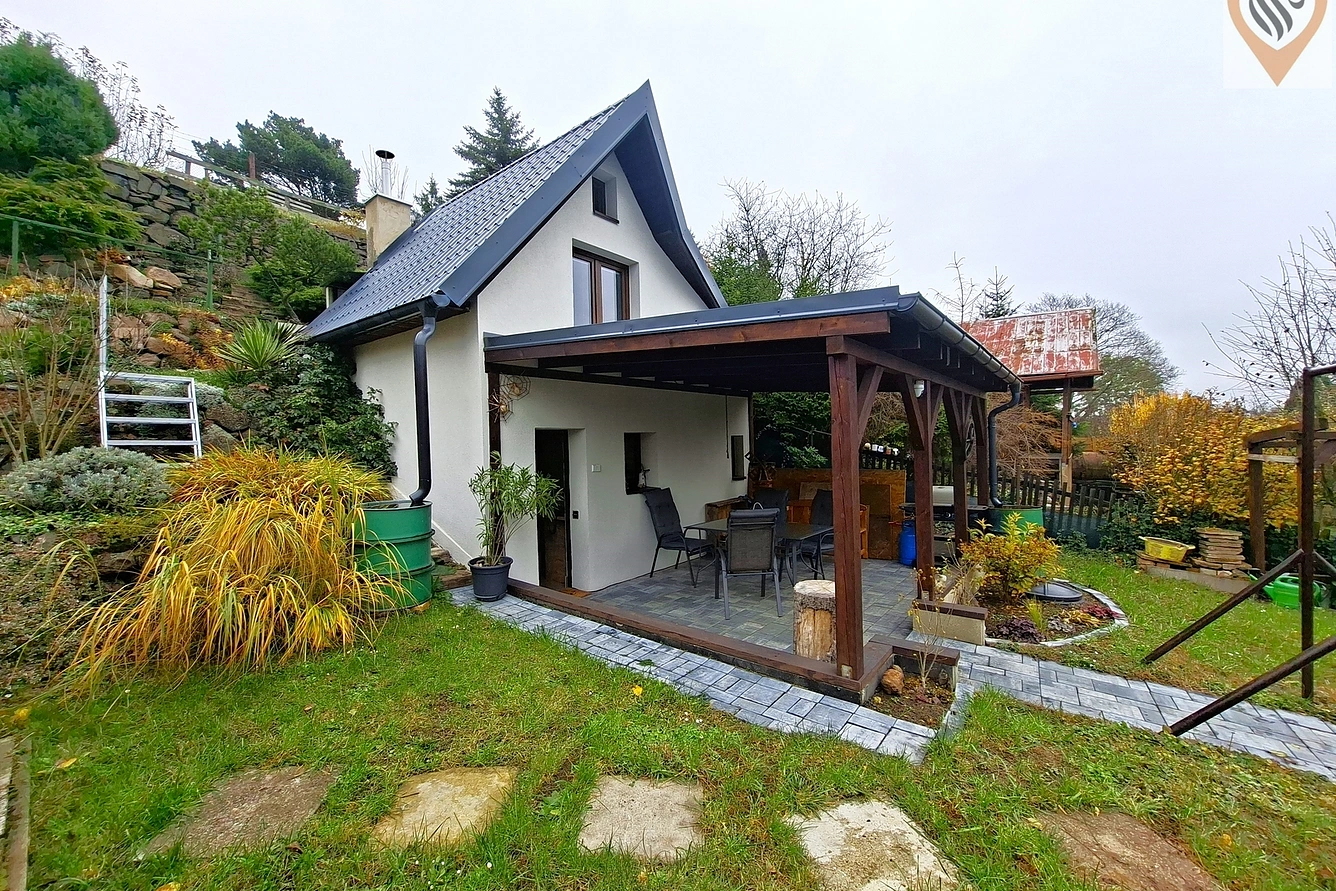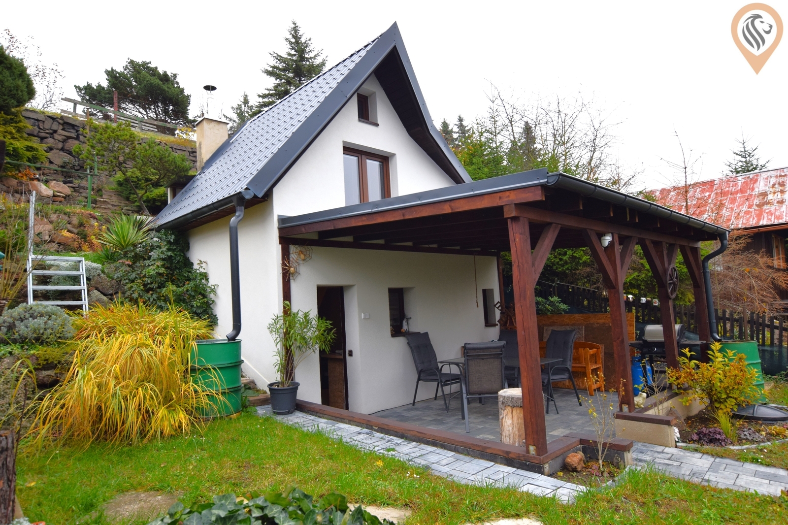 Zděná chata prošla kvalitní a pečlivou rekonstrukcí – nová střecha, okna, zateplení, kompletně nové rozvody, nový bojler a moderní kuchyňská linka.