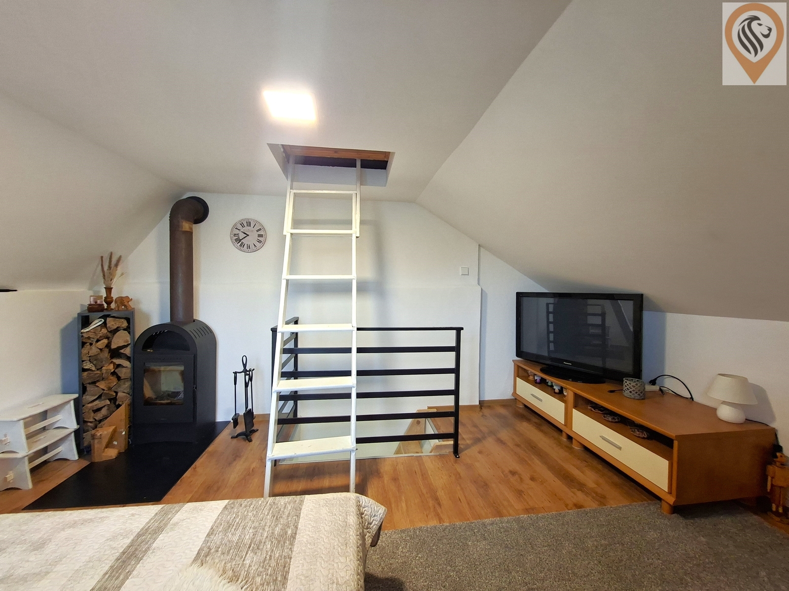 Po schodech vystoupáte do útulného podkroví s krbem, který dotváří příjemnou atmosféru chatové pohody.