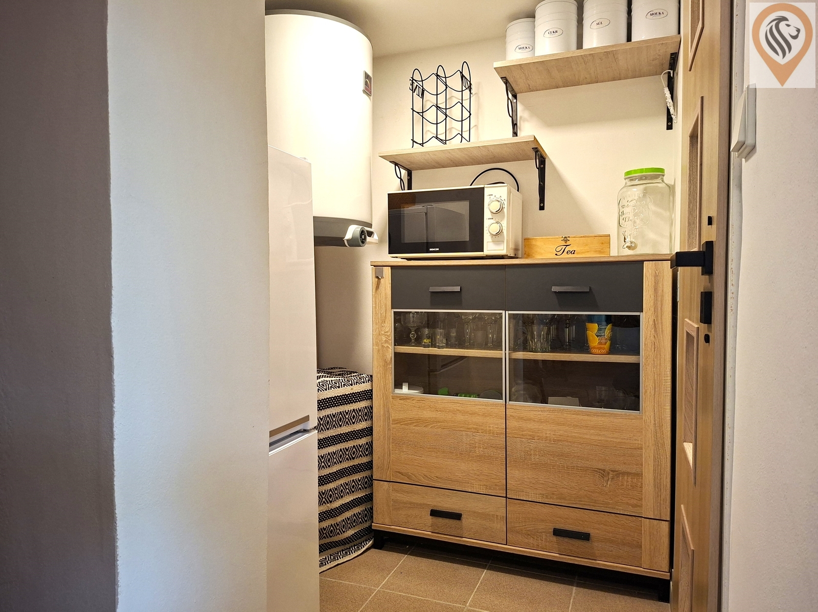 V přízemí se nachází rohová kuchyňská linka s jídelním posezením a technickým zázemím, které zajišťuje komfortní fungování.