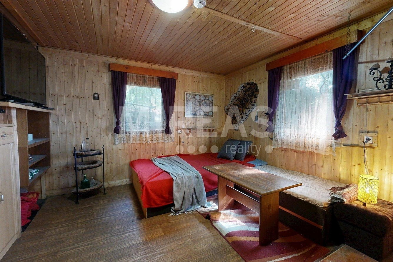 Chata má využitelná 3 patra. Ve zvýšeném přízemí je nachází vstupní chodba, kuchyň (s kombinovaným sporákem), obývací pokoj s kamny na tuhá paliva, místnost se 2 postelemi a koupelna s vanou. V dalším patře je jedna velká místnost s balkonem s výhledem na řeku. Poslední patro v podkroví lze upravit na další prostor pro spaní. Stěny jsou dřevěné, zateplené polystyrenem či hliníkovou fólií, která rovněž izoluje podlahu, střecha je plechová. WC je chemické, umístěné v přístavbě z druhé strany chaty, kde je také malá dílna. Do chaty je přivedena elektřina (400 V). Pozemek okolo chaty lze rovněž využívat.