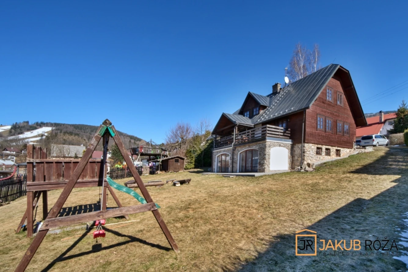 Citlivě navržená chalupa se nachází v klidné části městyse s perfektní dostupností všech služeb i zábavy. Veškeré služby centra města a sjezdovky jsou vzdáleny do 15 minut chůze, příjezd je možný celoročně běžným automobilem až ke vchodu do chaty, dostatek prostoru pro pohodlné parkování až 10 vozidel, dostatek soukromí a klidná okolní zástavba, jižně orientovaná slunná zahrada s dětským hřištěm, velkou trampolínou a ohništěm, dále prostorná venkovní, z poloviny zastřešená terasa s grilem a výhledem do kraje a na sjezdovky, společenská místnost s krbem, herna, finská sauna a velká vířivka.