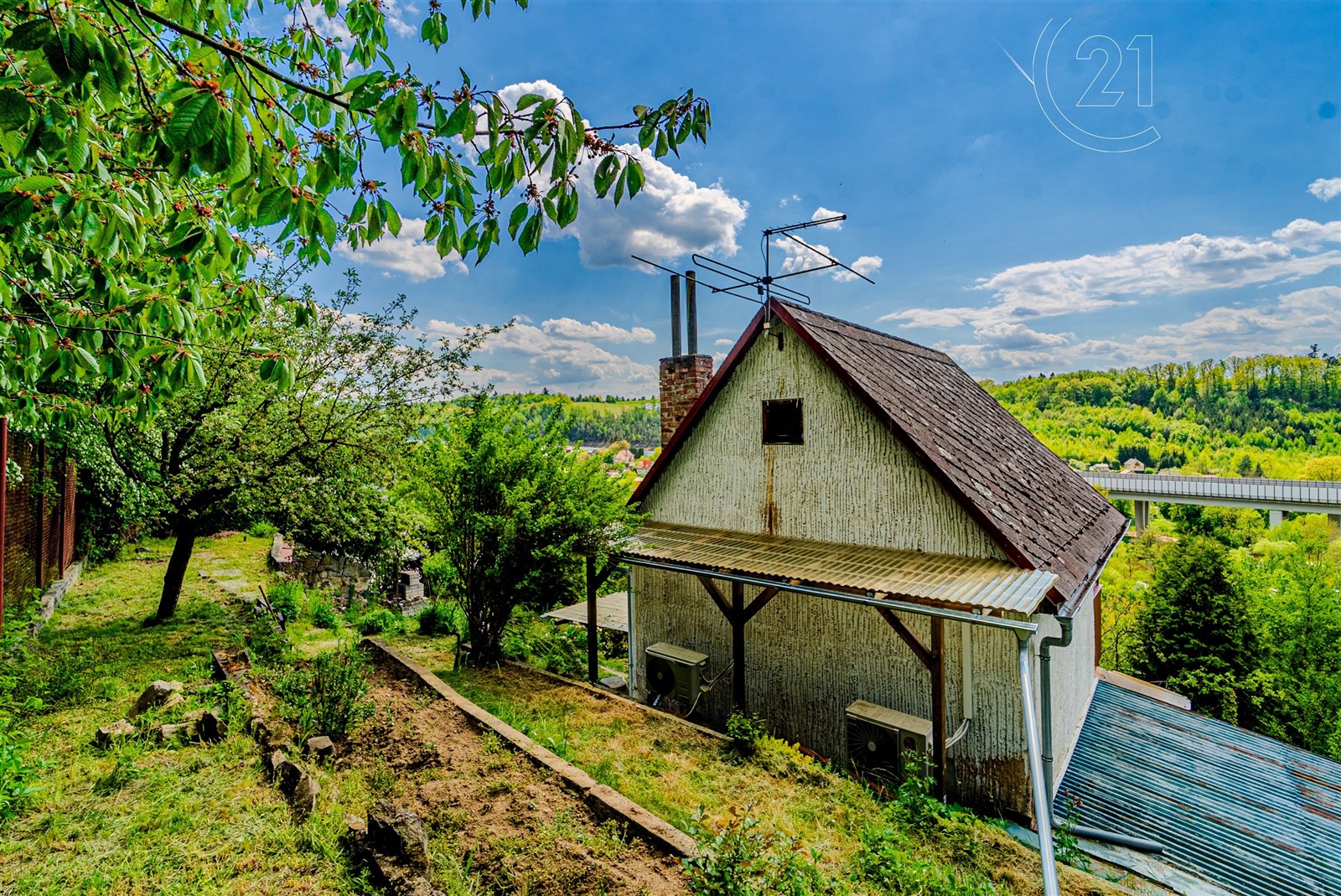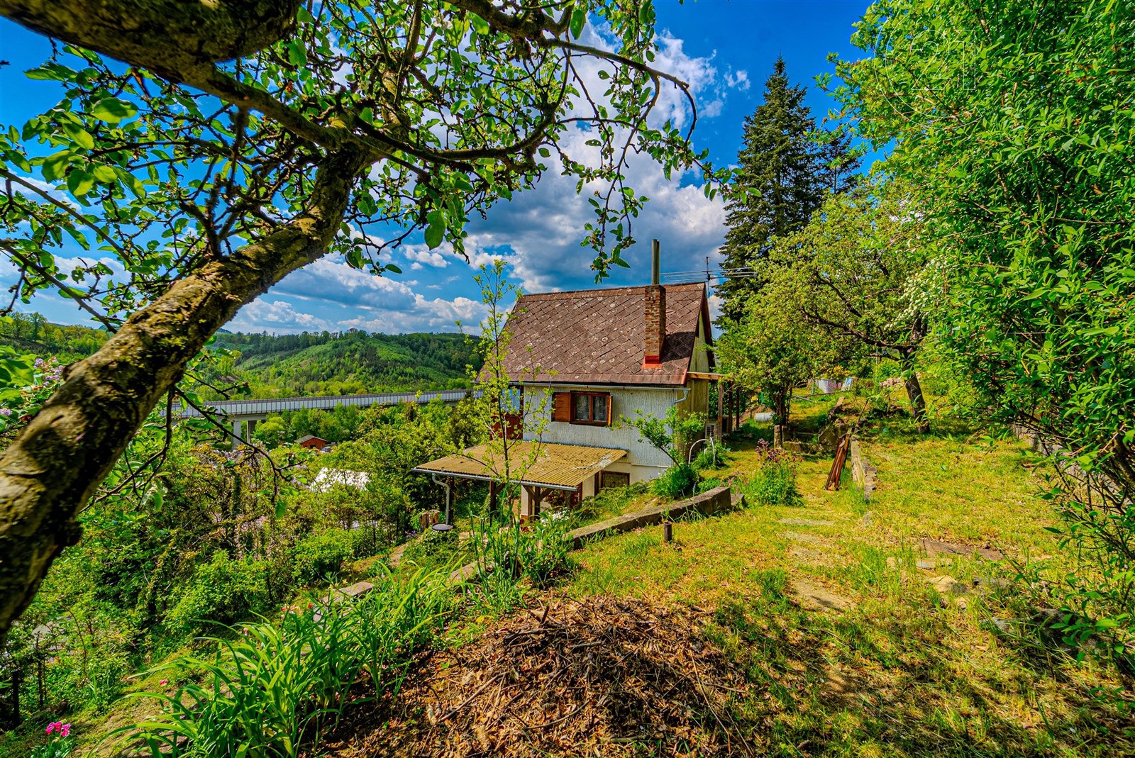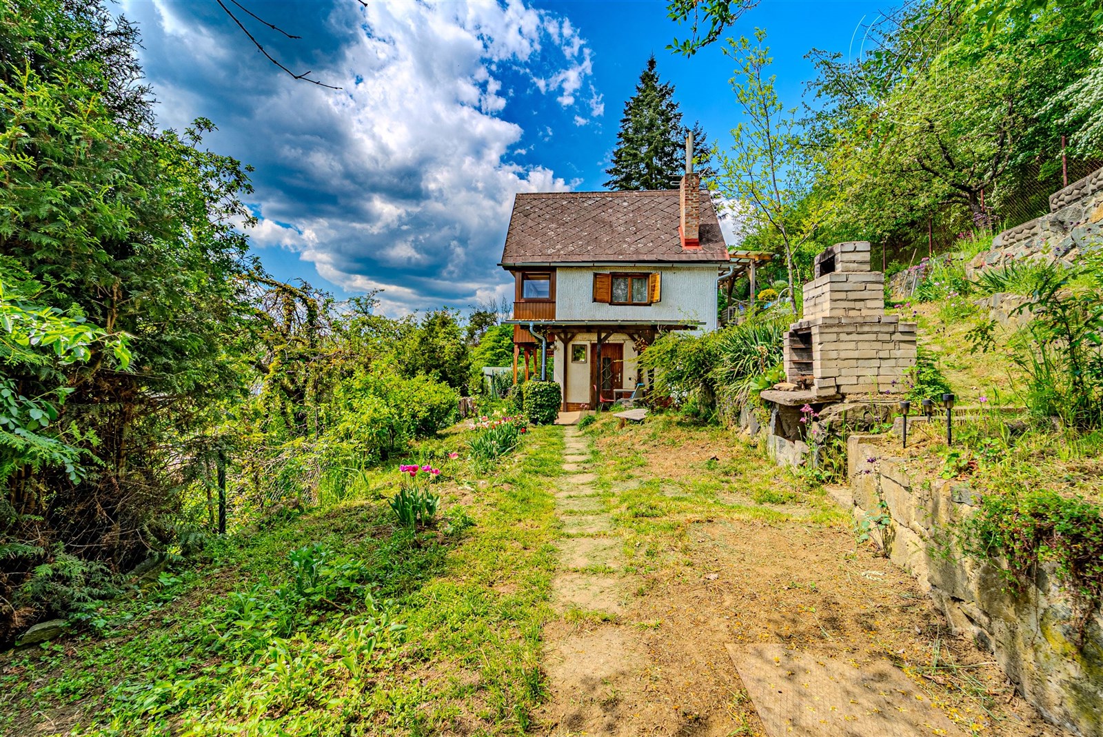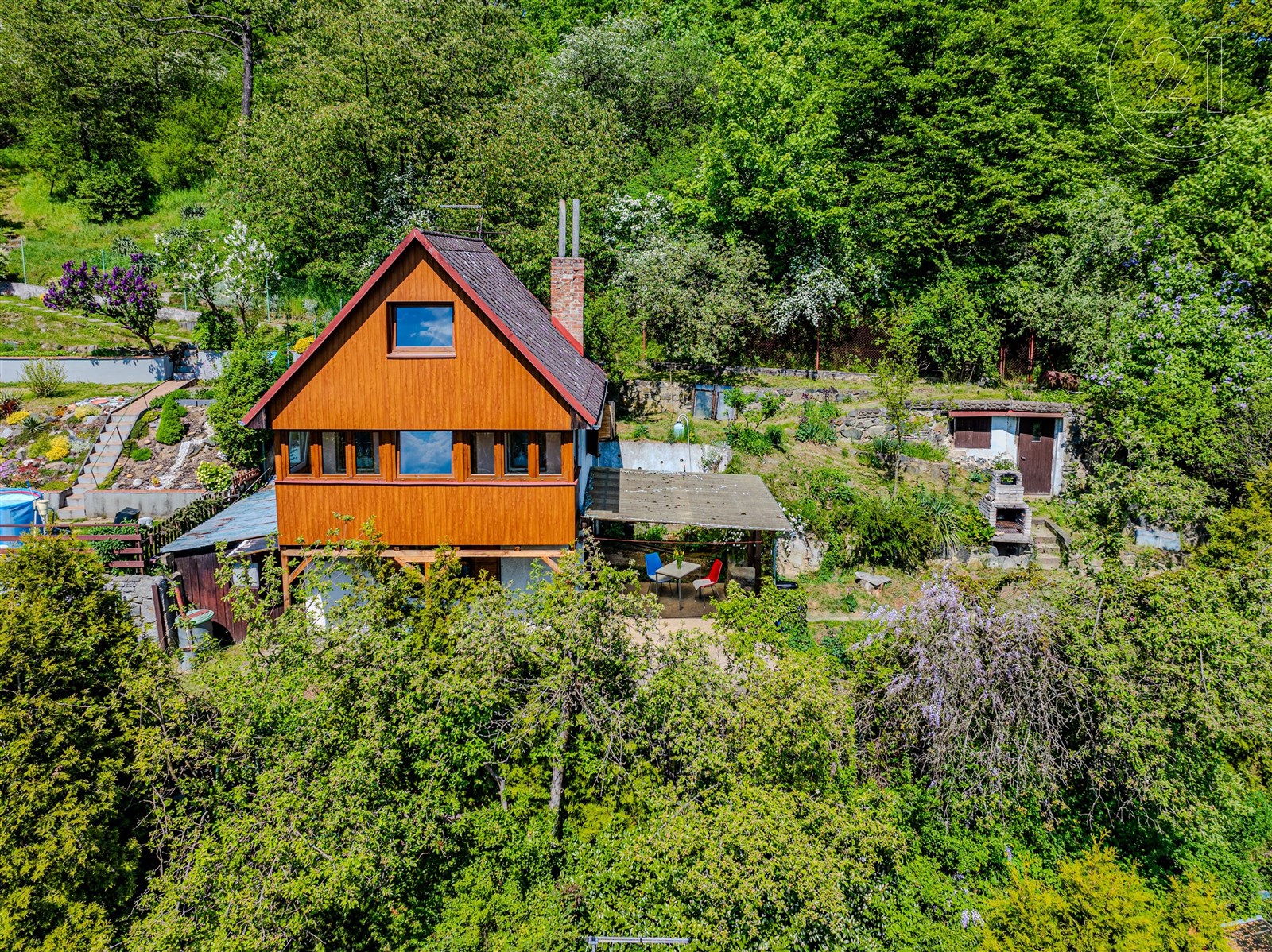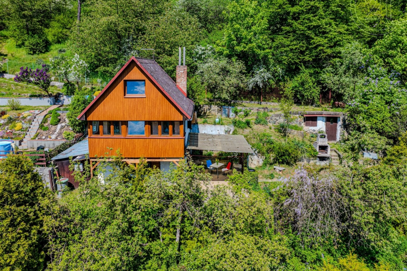 Pozemek je velikostí ideální pro snadnou údržbu a jsou zde květinové a zeleninové záhony. K chatě náleží dílna s pracovním pultem a k uskladnění vybavení či kol a krytá terasa. Orientace na jih zaručuje dostatek slunce po celý den a umístění ve svahu výhled na údolí řeky Sázavy. K pozemku je přístup ze dvou stran pouze pro pěší, z horní a ze spodní cesty, kde je možnost zaparkovat. Dostupnost do Prahy je díky blízké D1 20 minut.
