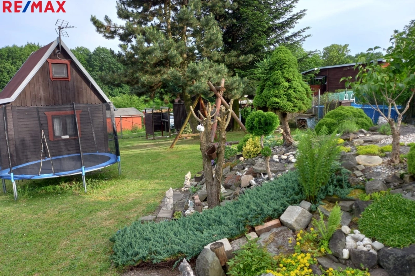 Ve skleníku si vypěstujete sladká rajčata, a na zahradě sklidíte třešně, švestky, jablka, ryngle, lískové oříšky, angrešt nebo justu. Zkušené zahradnice potěší ranní káva s výhledem na skalku, děti pak ocení trampolínu, která zůstává součástí vybavení.