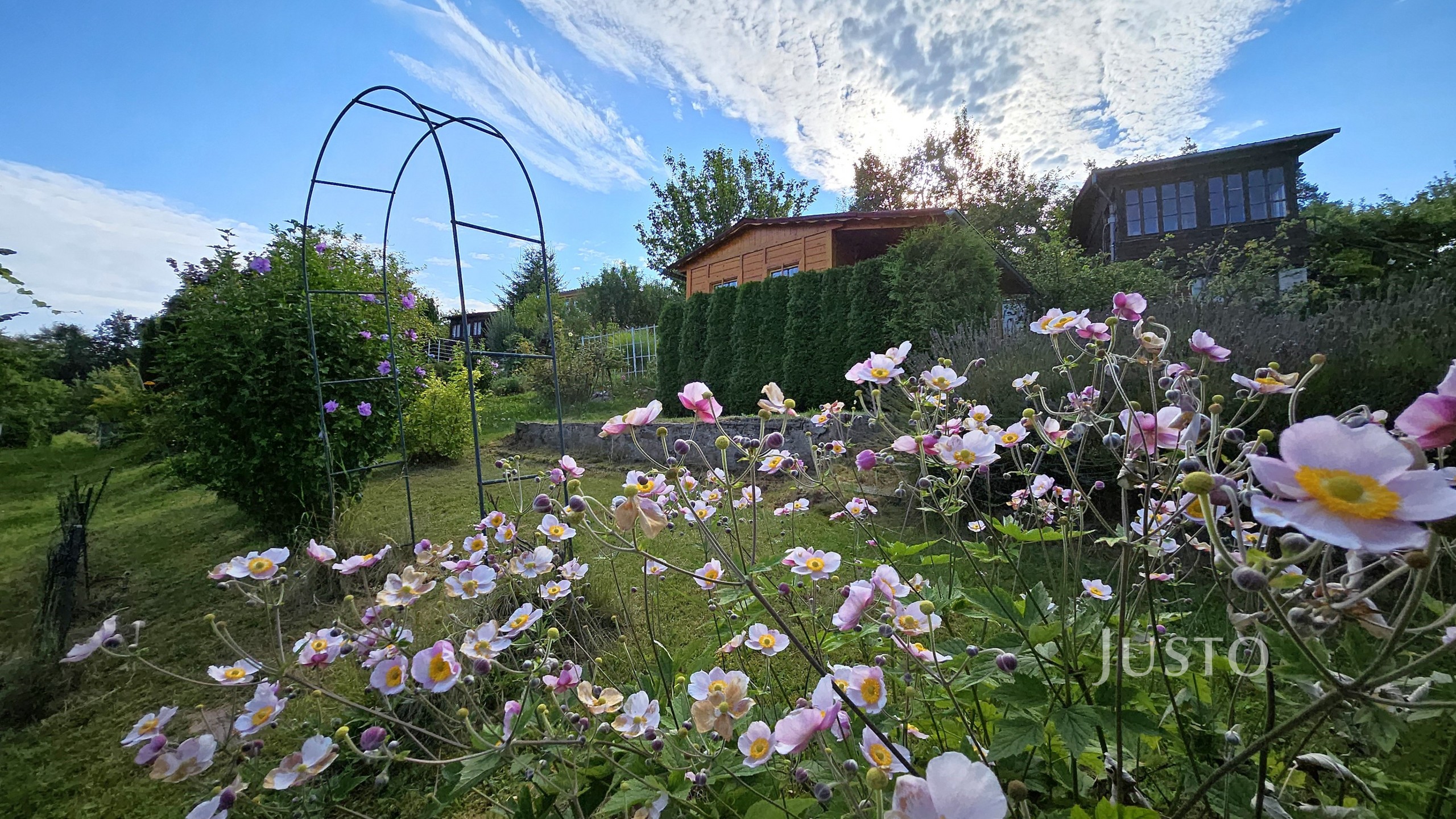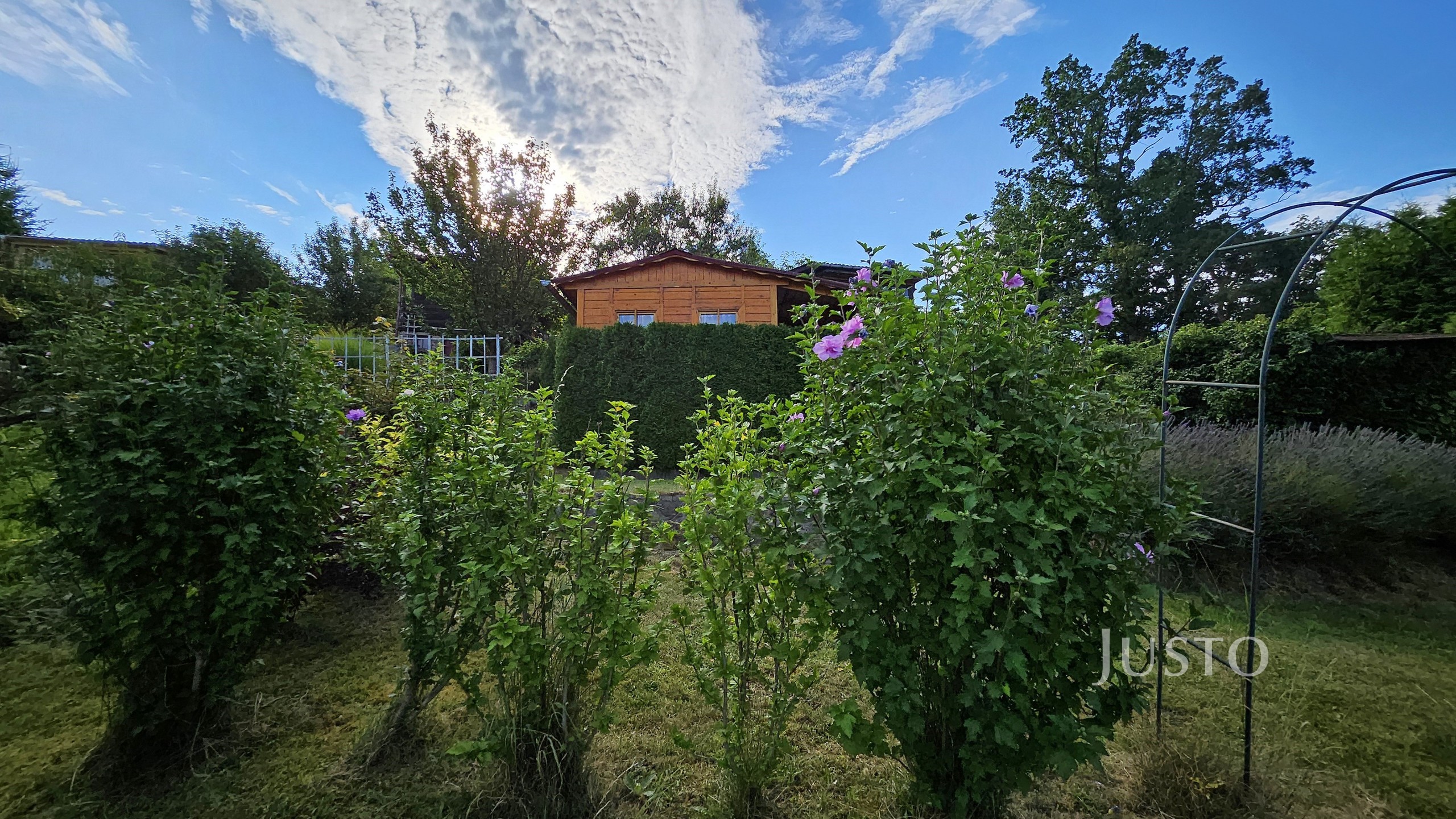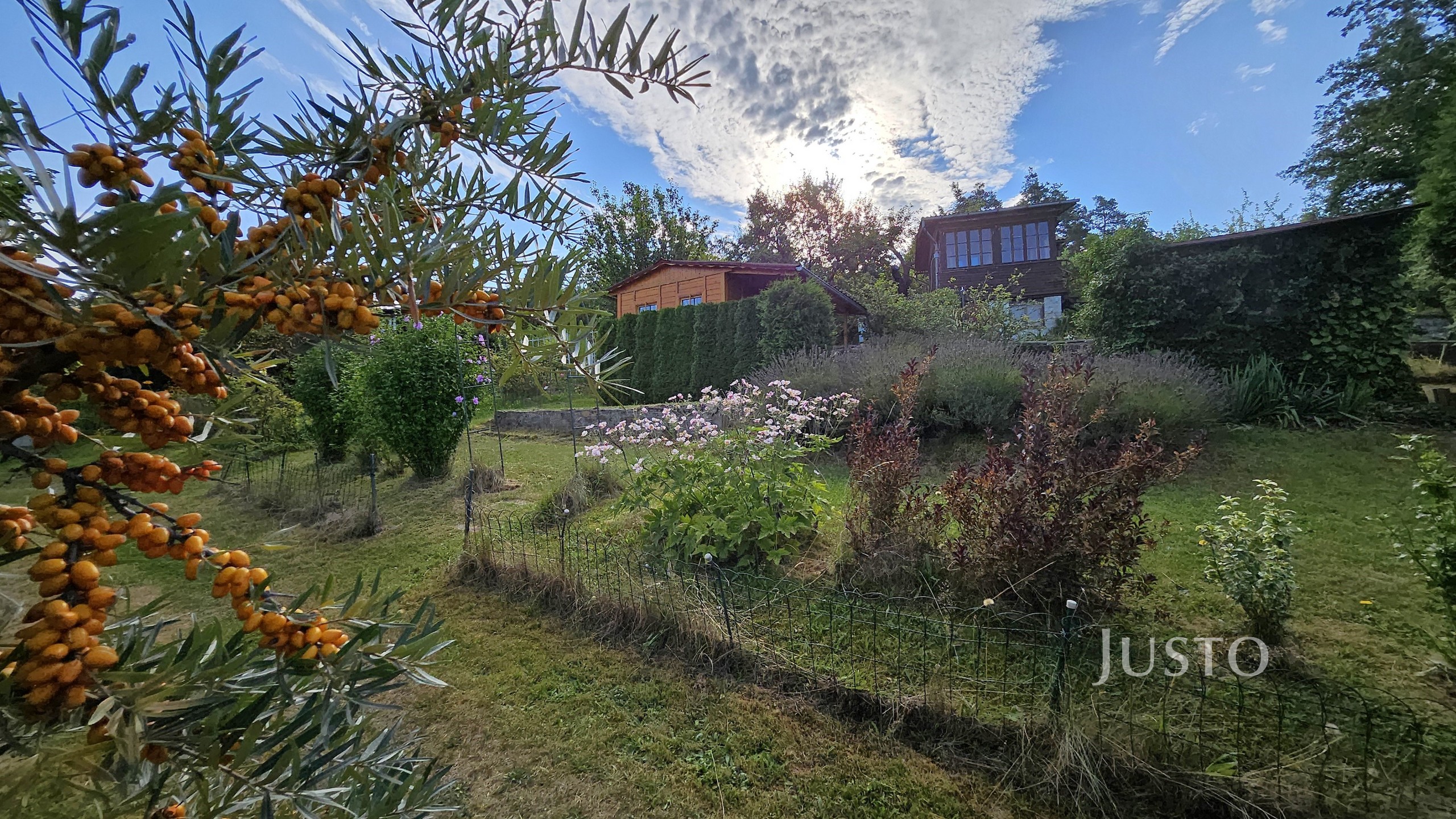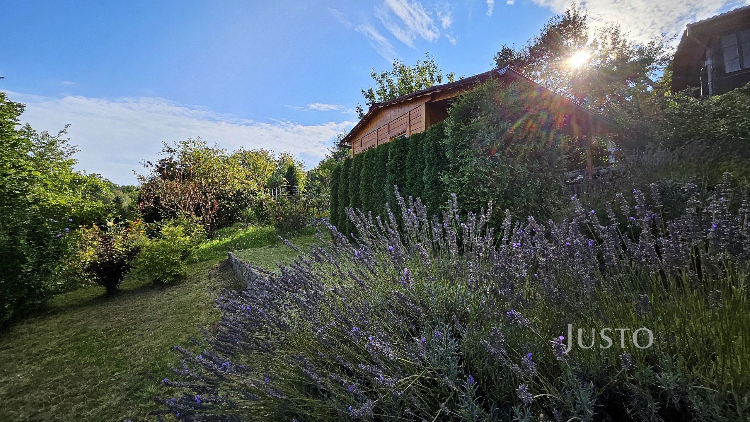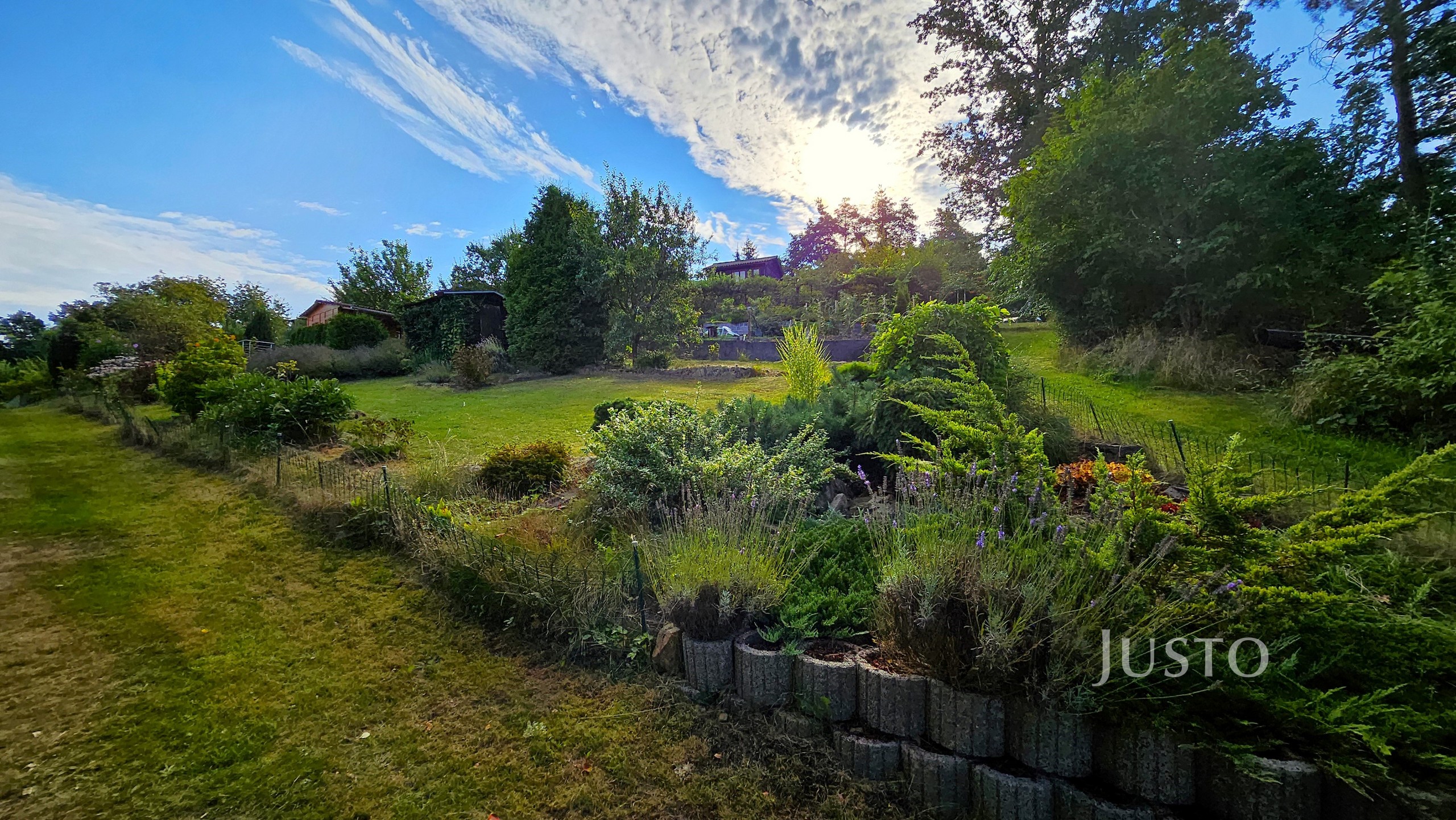 Pozemek je velmi pěkný, sice mírně svažitý, ale jsou zde terásky osázeny levandulemi a dalšími okrasnými květinami a keři.