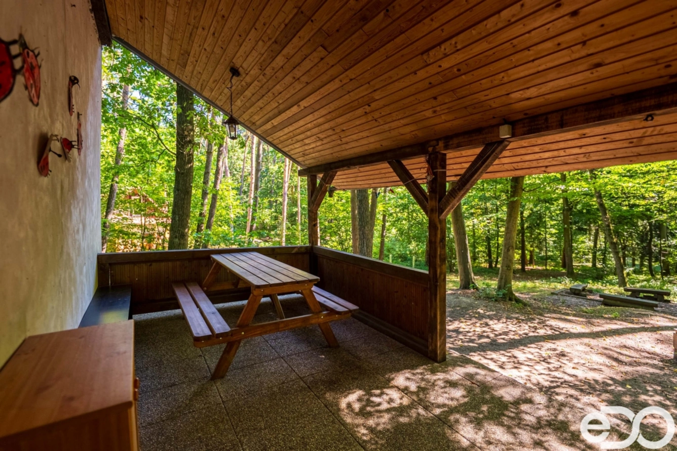 Chata je v dobrém stavu, s koupelnou po rekonstrukci, obývací částí s krbovými kamny a dvěma ložnicemi, které poskytují ubytování pro až 6 osob. Venkovní pergola s posezením a ohništěm dotváří příjemné zázemí pro odpočinek.