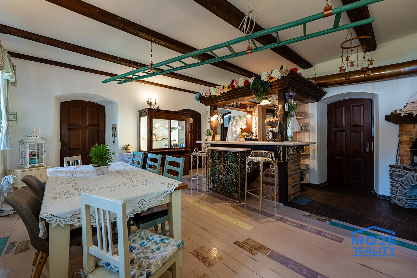 renovované dřevěné podlahy, nová okna (trojskla), kompletní renovace dřevěných trámů, koupelen i zázemí