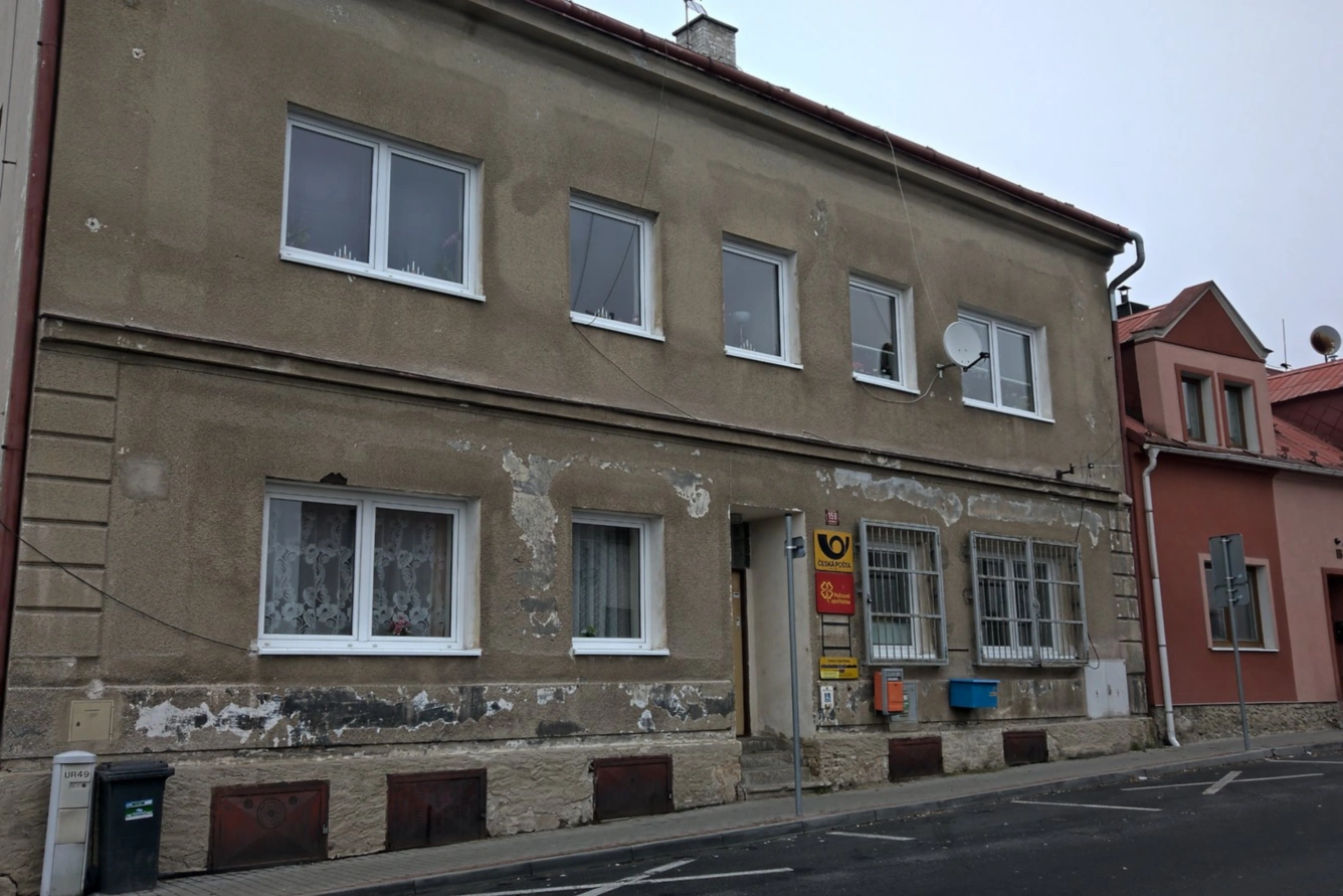 Jedná se o krajní stavbu řadové výstavby, podsklepenou, třípodlažní budovu na vlastním pozemku s bočním vjezdem do zadního traktu a dvěma přilehlými pozemky – zahradami. V budově jsou v 1 NP prázdné prostory po uzavřené pobočce a pronajatý byt 2+1. Ve 2 NP jsou dva nepronajaté byty a ve 3 NP ostatní nebytové prostory – sklady a půda a část bytové jednotky. Na pozemku p.č. 365 se nachází zděná garáž (nezapsaná – nezakreslená v KN). Dále se zde nachází neevidovaný plechový sklad. Obě stavby jsou naceněny ve znaleckém posudku. Typ budovy: zděná. Nosná konstrukce: cihly, kámen. Příčky: zděné. Klempířské konstrukce: pozink. Krovy: dřevo. Podkroví: pochůzí. Okna: dřevěná na půdě, plastová v 1 i 2NP (na některých oknech v přízemí – částečně mříže). Tvar střechy: sedlová. Krytina: alukryt. Fasáda: klasická omítka bez zateplení + hromosvod. Celkový stav nemovitosti: je dobrý. Závady: praskající zdi, dále jen běžné provozní závady. Stáří budovy: cca počátek minulého století.