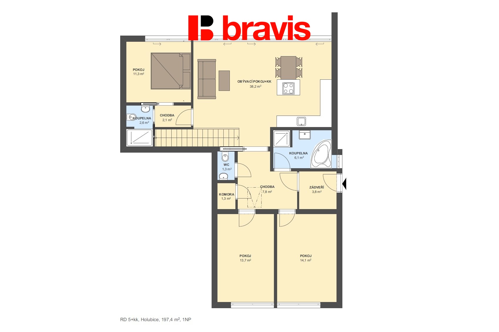 Dostatek prostoru, moderní technologie a klidná lokalita? Nabízíme k prodeji právě dokončující stavbu mimořádně prostorného polořadového rodinného domu o dispozici 5+kk s užitnou plochou 197,4 m2 na pozemku o velikosti 1126m2, v žádané lokalitě Holubice u Brna. Nemovitost, která je dispozečně řešena jako polořadový dům, bude ve vysokém standardu dokončena na konci podzimu. Moderní technologie a úsporný provoz Dům B je navržen s důrazem na maximální pohodlí a energetickou úspornost. Podlahové vytápění v celém domě zajišťuje příjemné teplo a komfort, zatímco tepelné čerpadlo v kombinaci s okny s trojskly a elektrickými žaluziemi garantuje nízké provozní náklady a vysoký standard bydlení. Energetická náročnost budovy je třídy B.Dispozice domu: První patro:• Dva prostorné pokoje – ideální pro děti nebo hosty• Komfortní ložnice s vlastní koupelnou• Velkorysý obývací pokoj propojený s prosvětlenou kuchyní • Šatna pro Vaše oblečení a praktická komora pro uskladnění potravin či domácích potřeb• Prostorná koupelna s kvalitním vybavením• Druhá koupelna s toaletou pro maximální pohodlí všech členů domácnostiPřízemí:• Dvojgaráž – bezpečné parkování pro dvě auta• Pracovna – ideální pro home office nebo studium• Dílna či domácí posilovna – prostor, kde můžete realizovat své koníčky nebo si udržovat kondici• Sklad – dostatek místa na nářadí a sezónní vybavení• Prádelna a technická místnost v jednom – praktické řešení pro každodenní provoz domácnosti• Samostatná toaletaKvalitní materiály a moderní designV celém domě budou použity kvalitní vinylové podlahy, které jsou nejen elegantní, ale i velmi odolné a snadné na údržbu. Velká okna s trojskly zajišťují dostatek denního světla a zároveň výbornou tepelnou i zvukovou izolaci. Elektrické žaluzie umožní regulovat světlo a soukromí dle Vašich potřeb.Lokalita Holubice – klid a pohodlí na dosah Brna Holubice patří mezi vyhledávané lokality díky své blízkosti k Brnu a zároveň klidnému prostředí s veškerou občanskou vybaveností. V okolí najdete školy, školky, obchody, sportoviště i krásnou přírodu pro volnočasové aktivity. Díky své poloze nabízí rychlé napojení na dálniční síť.Pokud už se v tomto domě vidíte, neváhejte mě kontaktovat.