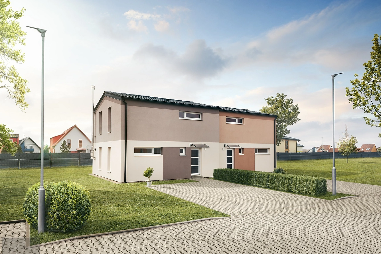 Prodám nízkoenergetický rodinný dům v Těptíně s podlahovou plochu 96,7 m2, jedná se o jednu sekci dvojdomu. Prodávaná bytová jednotka má dispozici 4+1 a poskytuje tak dostatečný prostor pro spokojený rodinný život.Samozřejmostí každé jednotky je vlastní vchod. Jednotky jsou oddělené izolací a nemají společné stěny. Vzájemné vztahy k jednotce i pozemku budou upravené prohlášením vlastníka.Bohatý vnitřní prostor zahrnuje v přízemí obývací pokoj s prakticky odděleným kuchyňským koutem a v patře ložnici a 2 dětské pokoje. Součástí rodinného domu je i samostatná toaleta a samostatná koupelna.Dům bude za uvedenou cenu kompletně stavebně dokončen (včetně krbového komínu) a připraven k okamžitému nastěhování. Vnější i vnitřní provedení domu provedeme dle Vašeho individuálního výběru.K patě pozemku jsou přivedeny tyto inženýrské sítě: rozvody NN, kanalizace, veřejný vodovod.Uvedená cena je včetně pozemku, typové základové desky a DPH. Doba výstavby 3 - 4 měsíce.Těptín se nachází jižně od Prahy - autem jste na okraji Prahy za 25 minut. Najdete tu základní i mateřskou školu. Autobus do Prahy jezdí z nedaleké Kamenice (většina linek sem jezdí z Prahy od stanice metra C Budějovická), kde také najdete veškerou občanskou vybavenost - obchody, restaurace, poštu, obecní úřad.