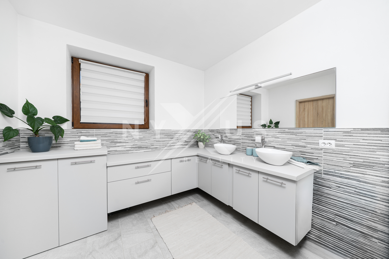 Už při vstupu zaujme velký a světlý obývací pokoj, který přirozeně navazuje na terasu a zahradu. Je to místo, kde se budete rádi scházet s rodinou i přáteli, ať už v zimě u krbu, nebo v létě s otevřenými dveřmi na terasu. Kuchyň s jídelní částí tvoří přirozené centrum celého domu a poskytuje dostatek prostoru pro každodenní vaření i společné večeře.