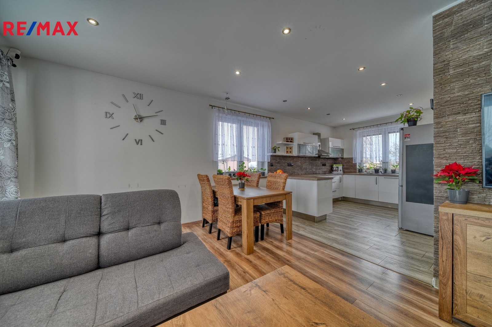 Praktická dispozice 4+kk nabízí prostorný obývací pokoj propojený s kuchyní. Kuchyňská linka je vybavena vestavěnými spotřebiči – indukční varnou deskou, troubou i digestoří – a doplněná o velmi praktickou spíž.