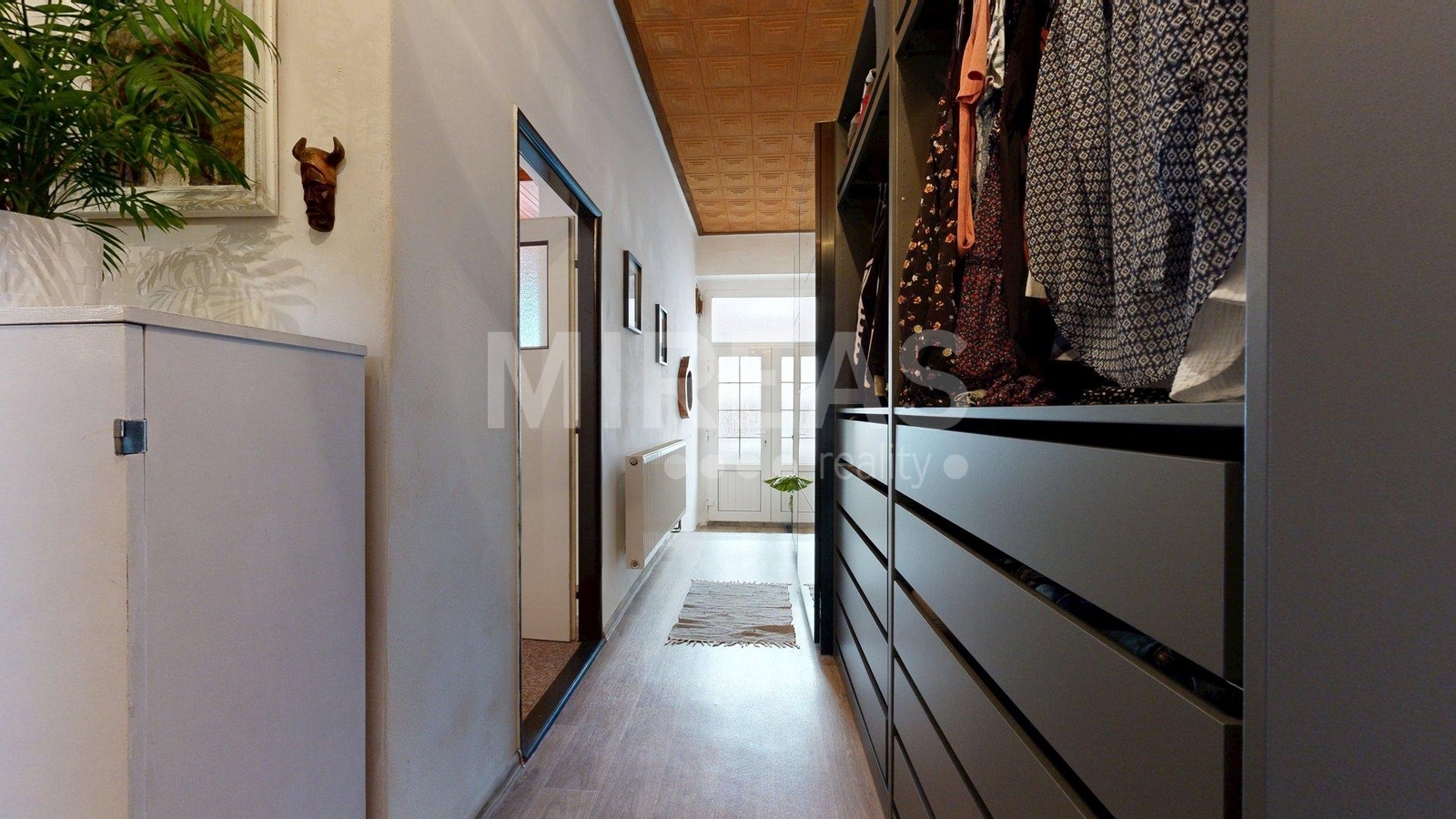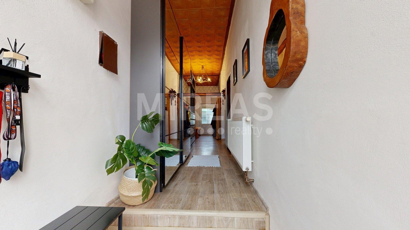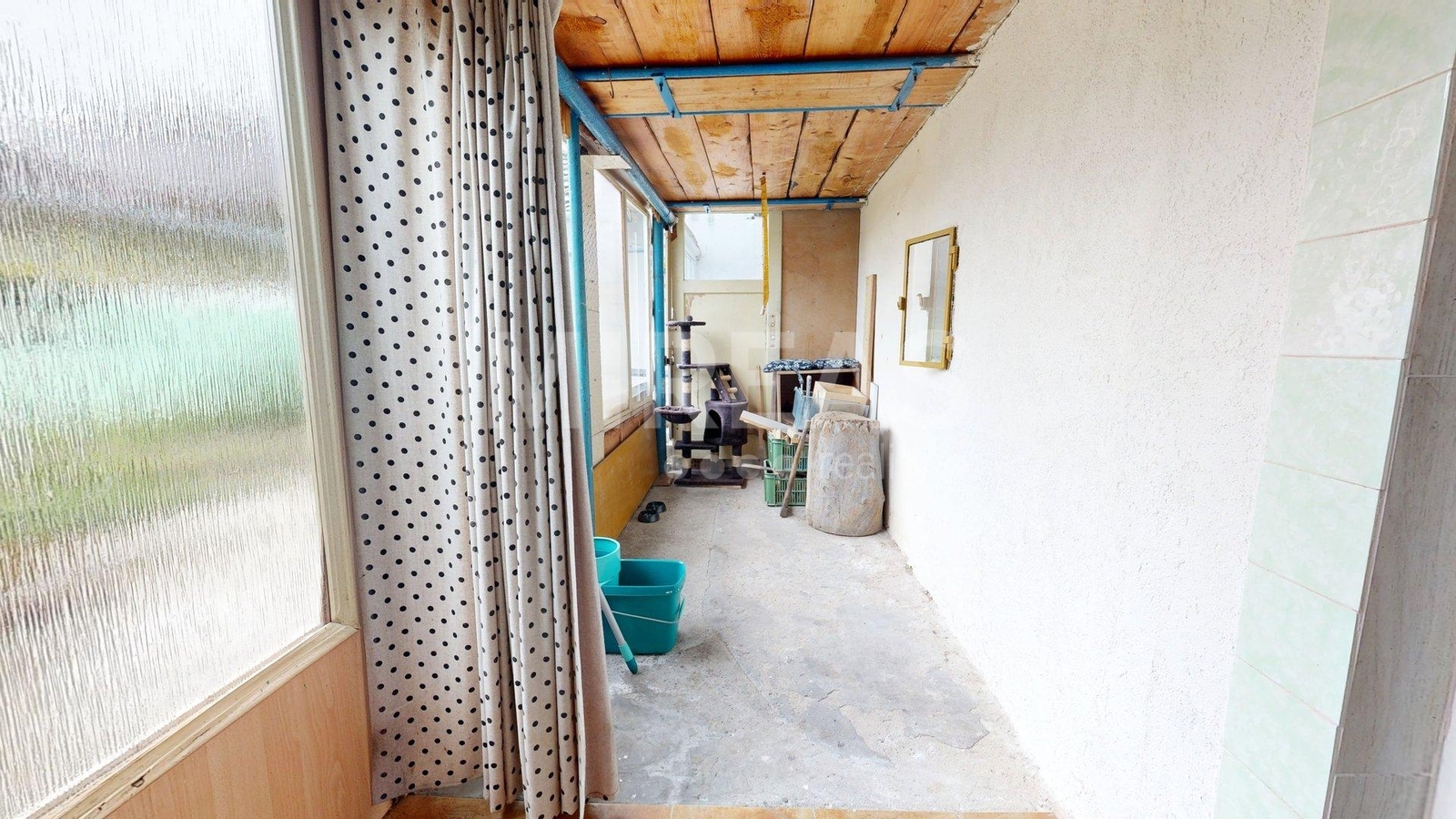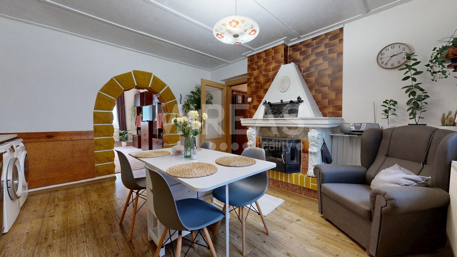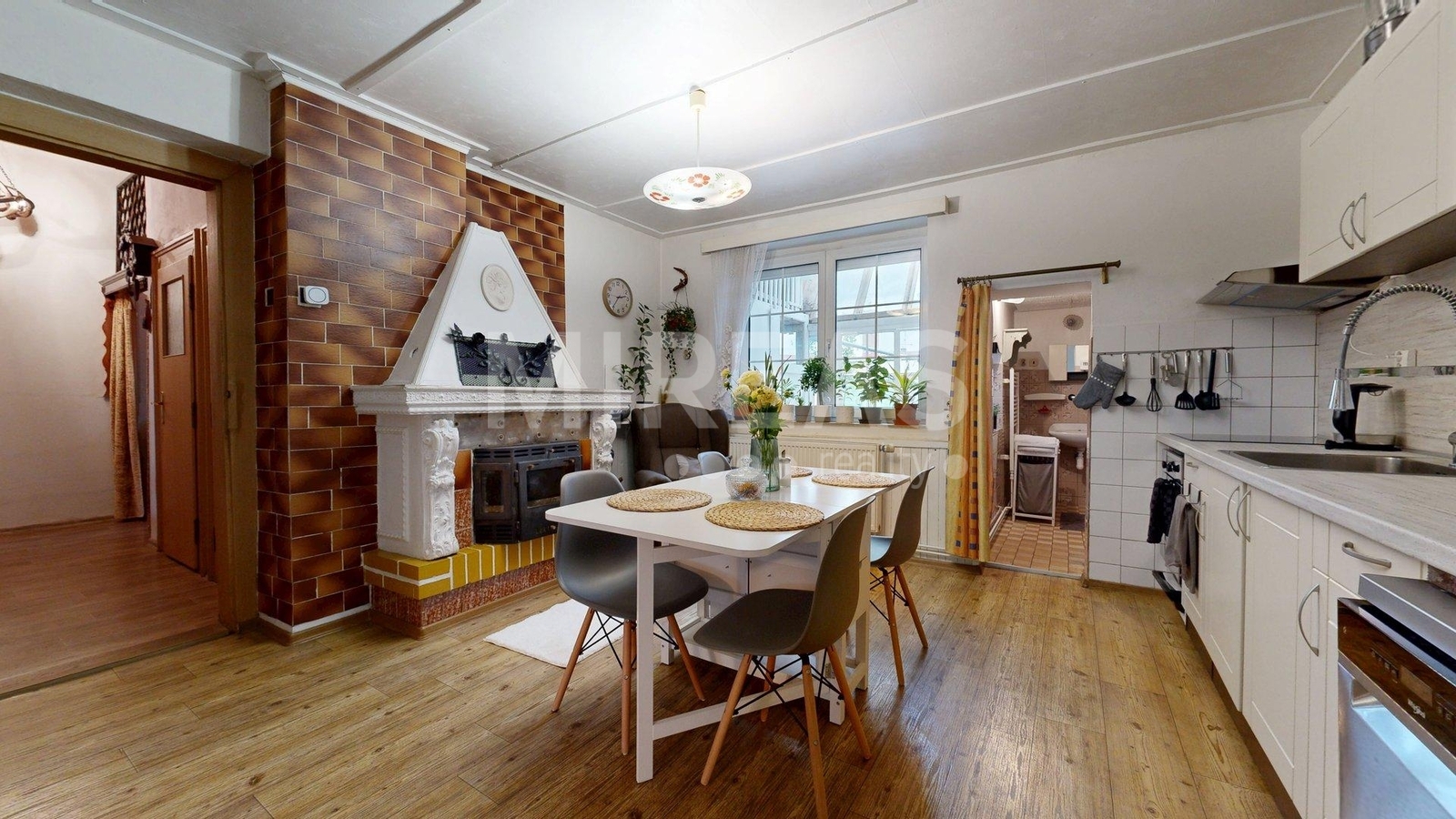 Dispozice RD: vstupní prostorná chodba s úložnými prostory, samostatná ložnice, obývací pokoj, samostatná větší kuchyň s dominantním krbem (krb není aktuálně funkční, je potřeba jej rekonstruovat), koupelna s vanou a umyvadlem, samostatné WC, vstupní schodiště do podkroví a vchod na dvorek u domu v zadní části. Výstup na dvůr je tvořen z části zakrytou verandou. Na dvoře k dispozici zeleninová a květinová zahrádka, ovocné a okrasné keře, dva samostatné menší objekty (kůlna/úložný prostor, dílna - zde umístěná studna).