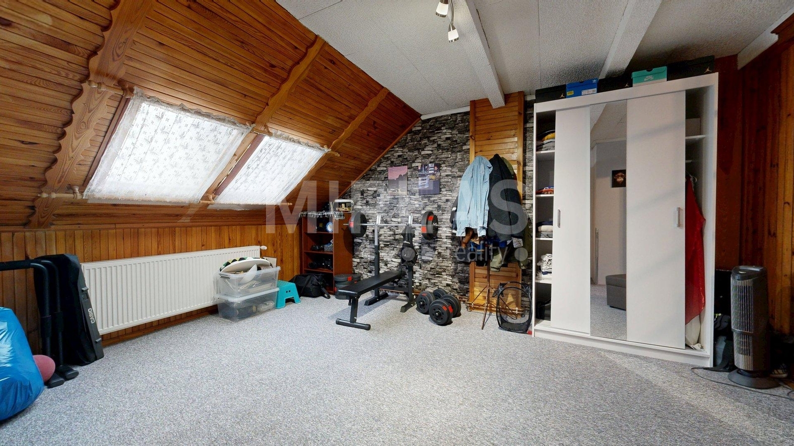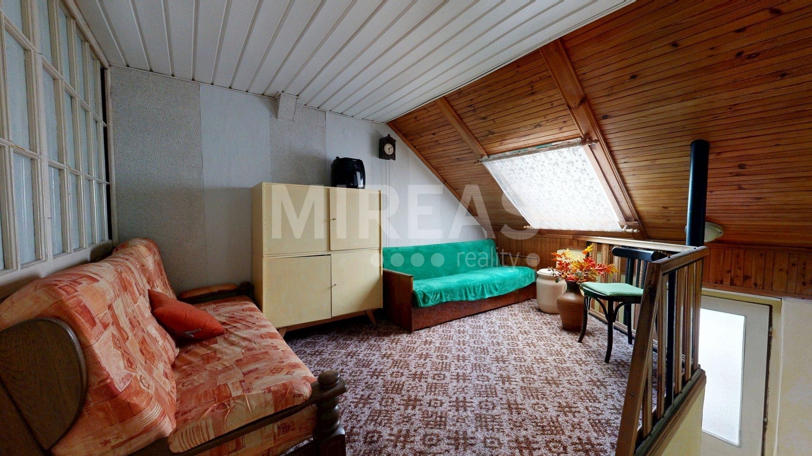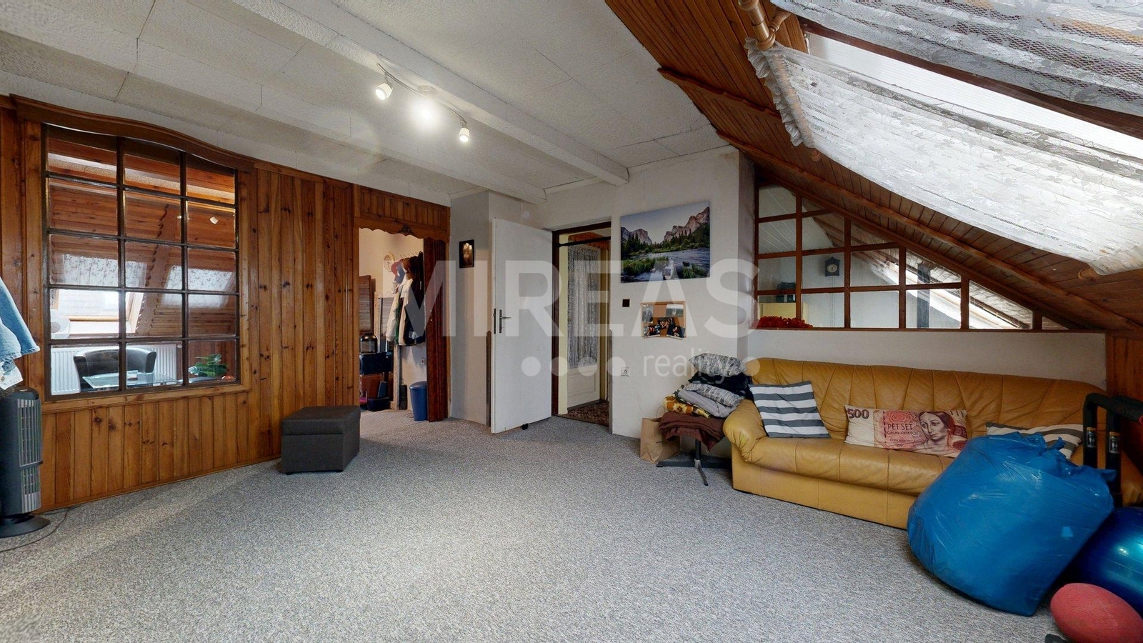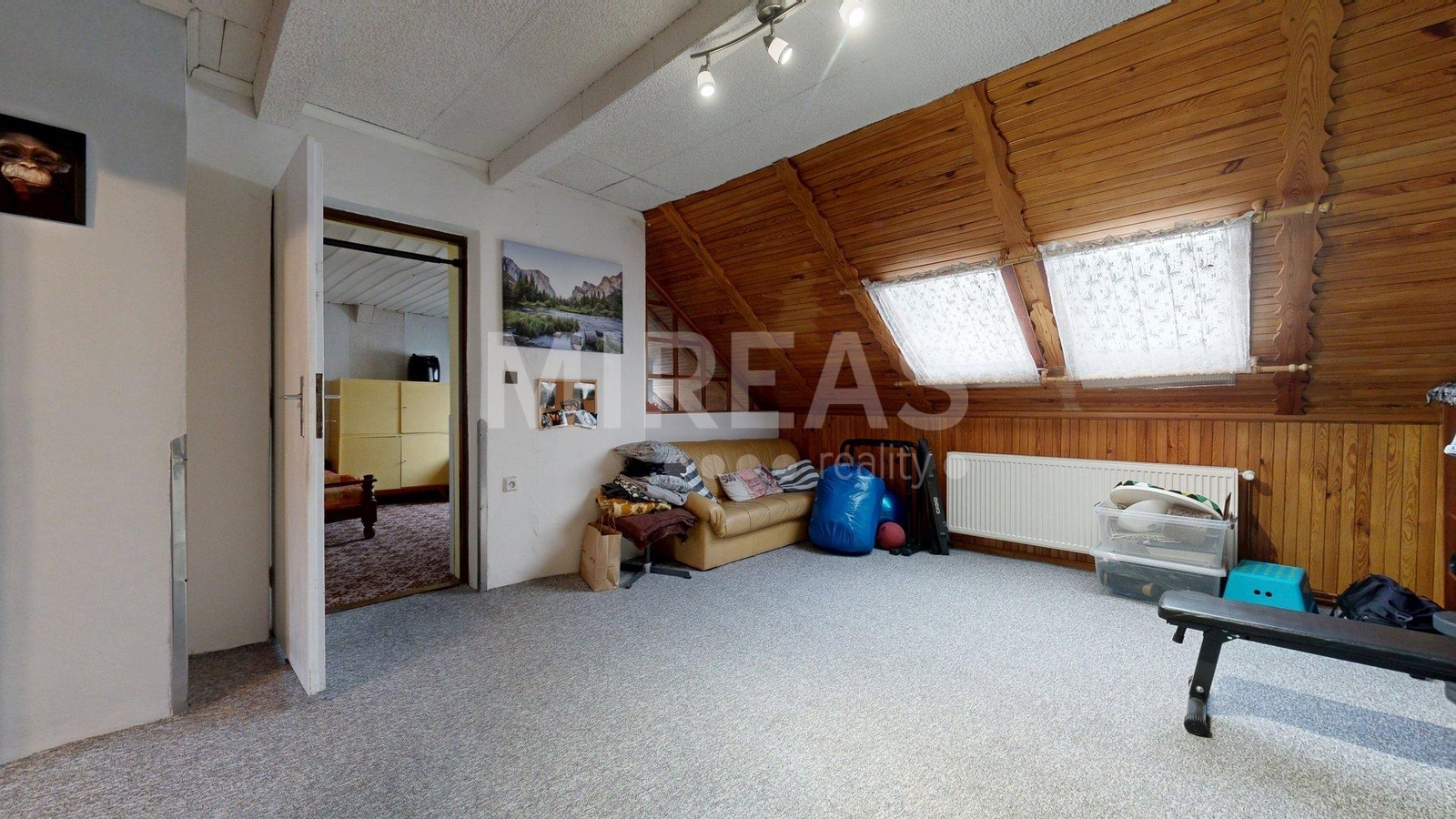 Dispozice podkroví: schodiště, krytý balkón, chodba, dva pokoje a vstup na půdu, kterou je možné přestavět na další obytný pokoj. Podkroví není aktuálně zateplené, nicméně vytápění místností v podkroví je zajištěno centrálně radiátory z elektrokotle, jako vytápění celého domu.