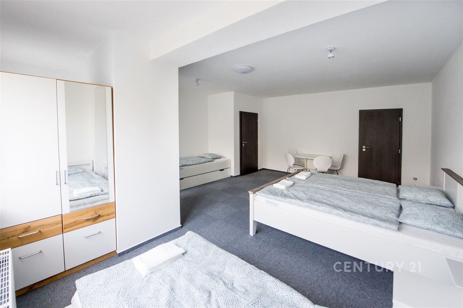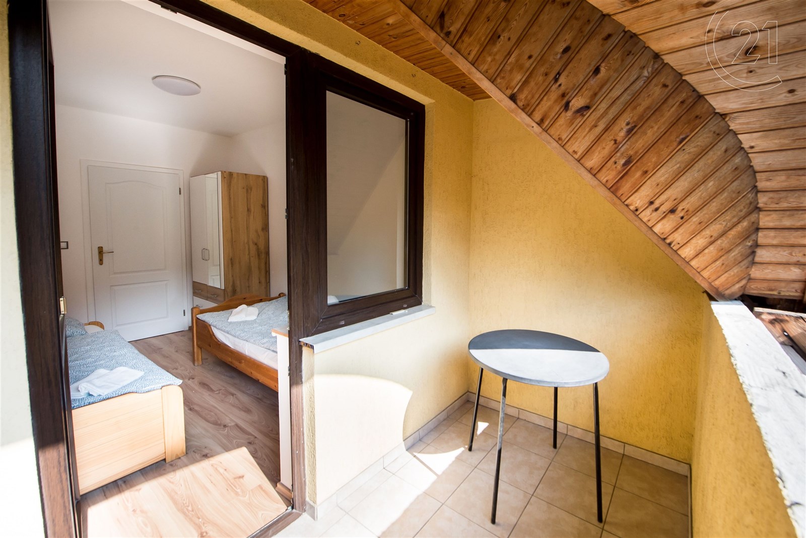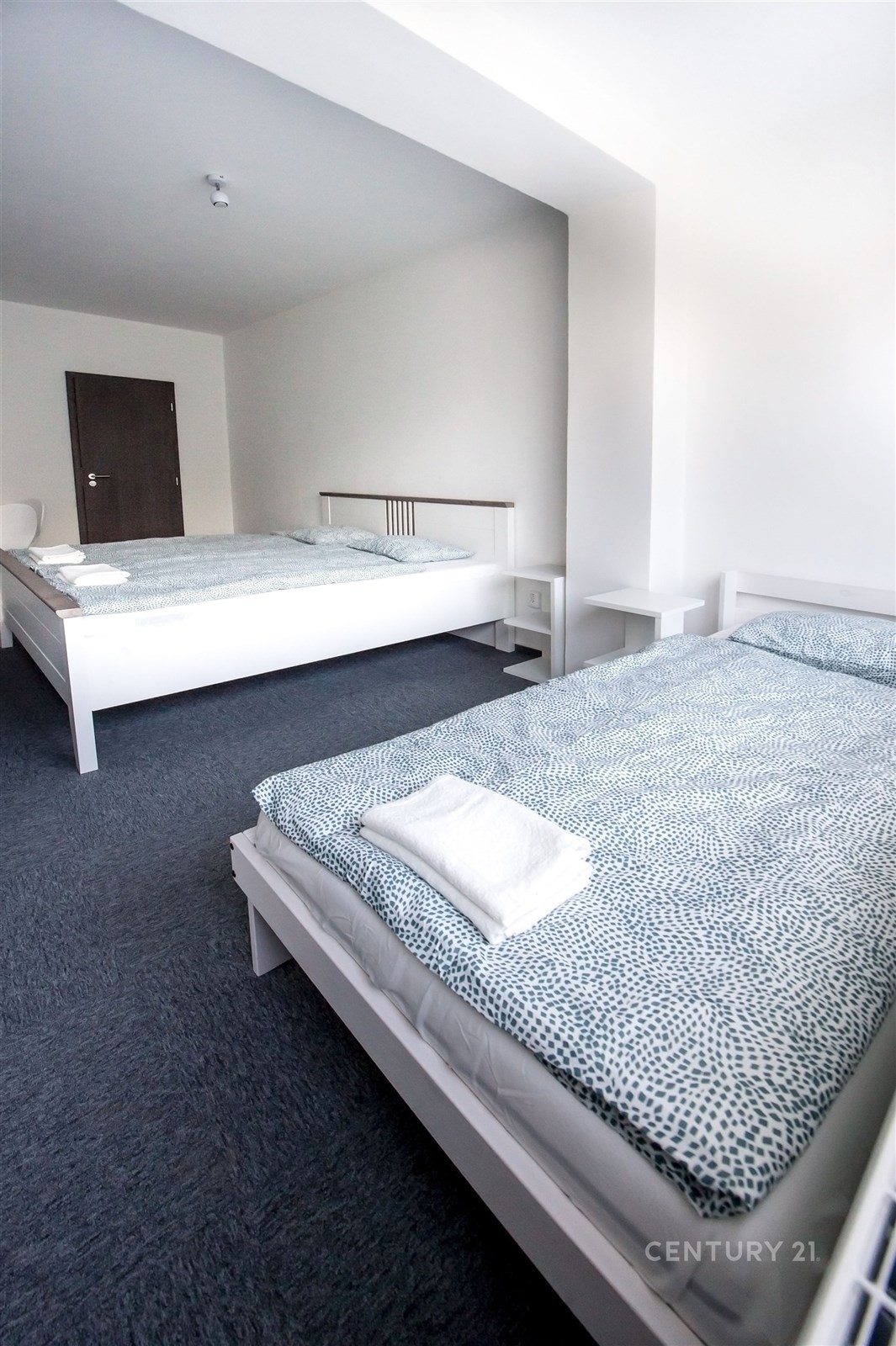 Nabízíme vám k prodeji řadový rodinný dům v Mostě Souši. Dům je po celkové rekonstrukci upravený na ubytovací zařízení. Je zateplený, má čtyři nadzemní podlaží. Výměra parcely je 279 m2, vnitřní užitná plocha je 312 m2. Nemovitost disponuje 26 lůžky. V prvním nadzemním podlaží jsou vybudovány dva apartmány (čtyřlůžkový a třílůžkový). Oba apartmány mají koupelnu a WC. V třílůžkovém apartmánu je i kuchyňská linka a má venkovní terasu s přístupem na zahradu. V druhém nadzemním podlaží jsou čtyři pokoje: dvoulůžkový, třílůžkový (tyto pokoje mají společné WC a koupelnu). Dále jsou tu dva třílůžkové pokoje s vlastní koupelnou i WC. Ve třetím nadzemním podlaží se nacházejí tři pokoje. Jeden je dvoulůžkový, zbývající dva jsou třílůžkové. Tyto pokoje mají společnou terasu. Na tomto patře je společná kuchyně a jsou tu dvě koupelny s WC. V přízemí se nachází garáž, tři místnosti, technická místnost a prádelna. Tato nemovitost má polohu na okraji Mostu, přímo naproti vjezdu do autodromu. Nedaleko je nádrž Matylda, která nabízí spoustu volnočasových aktivit, blízko je to i k mosteckému jezeru a na hrad Hněvín. Veškerá občanská vybavenost je v centru města, které je poblíž. Nemovitost je vhodná jako investice s velkým potenciálem, prodává se včetně vybavení. Zavolejte si pro další informace nebo si rovnou domluvte prohlídku. S případným financováním vám rádi pomůžeme.