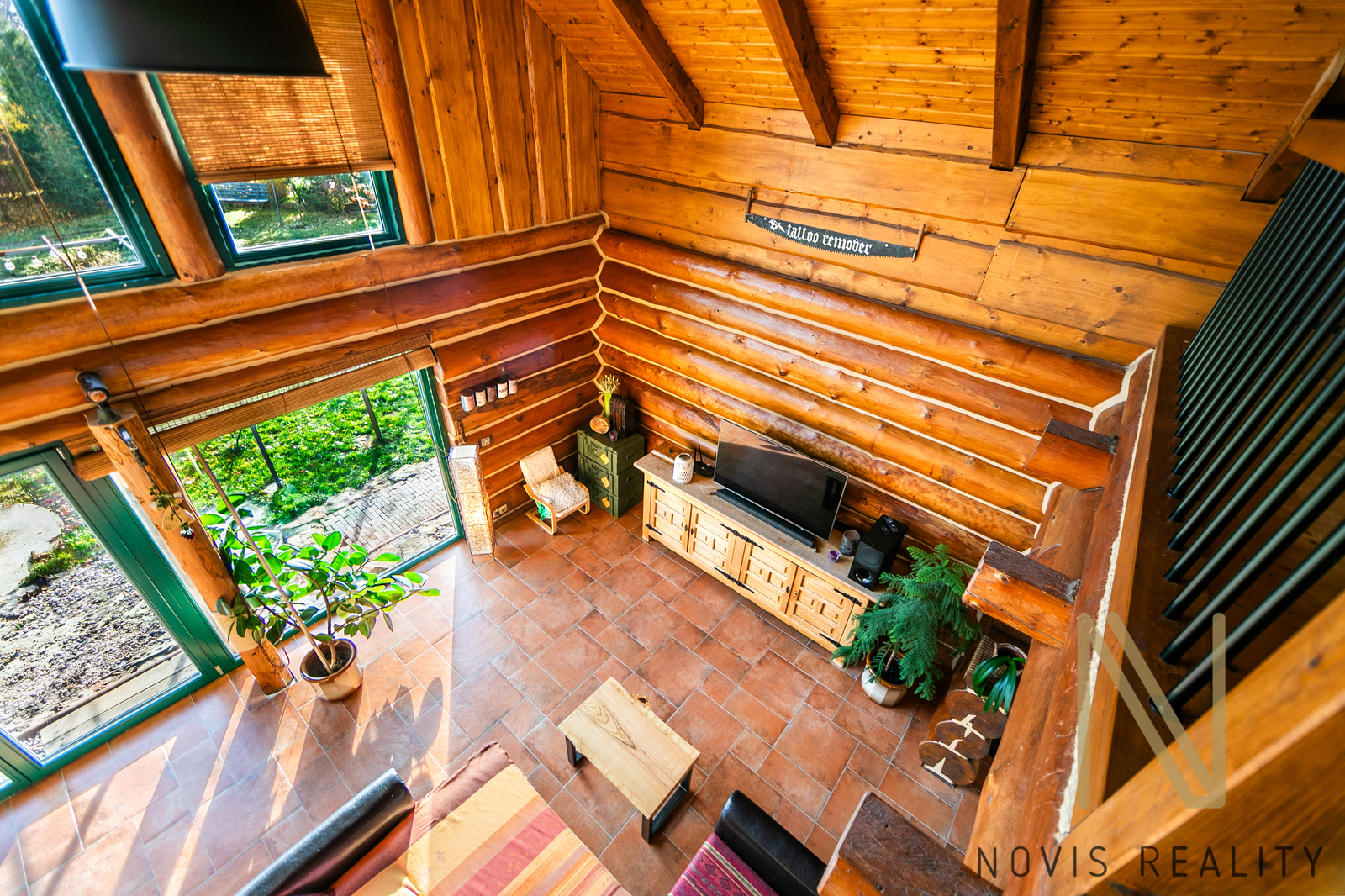 Vytápění a ohřev vody zajišťuje tepelné čerpadlo, v celém domě je podlahové vytápění a díky srubové konstrukci jsou provozní náklady dlouhodobě velmi nízké.