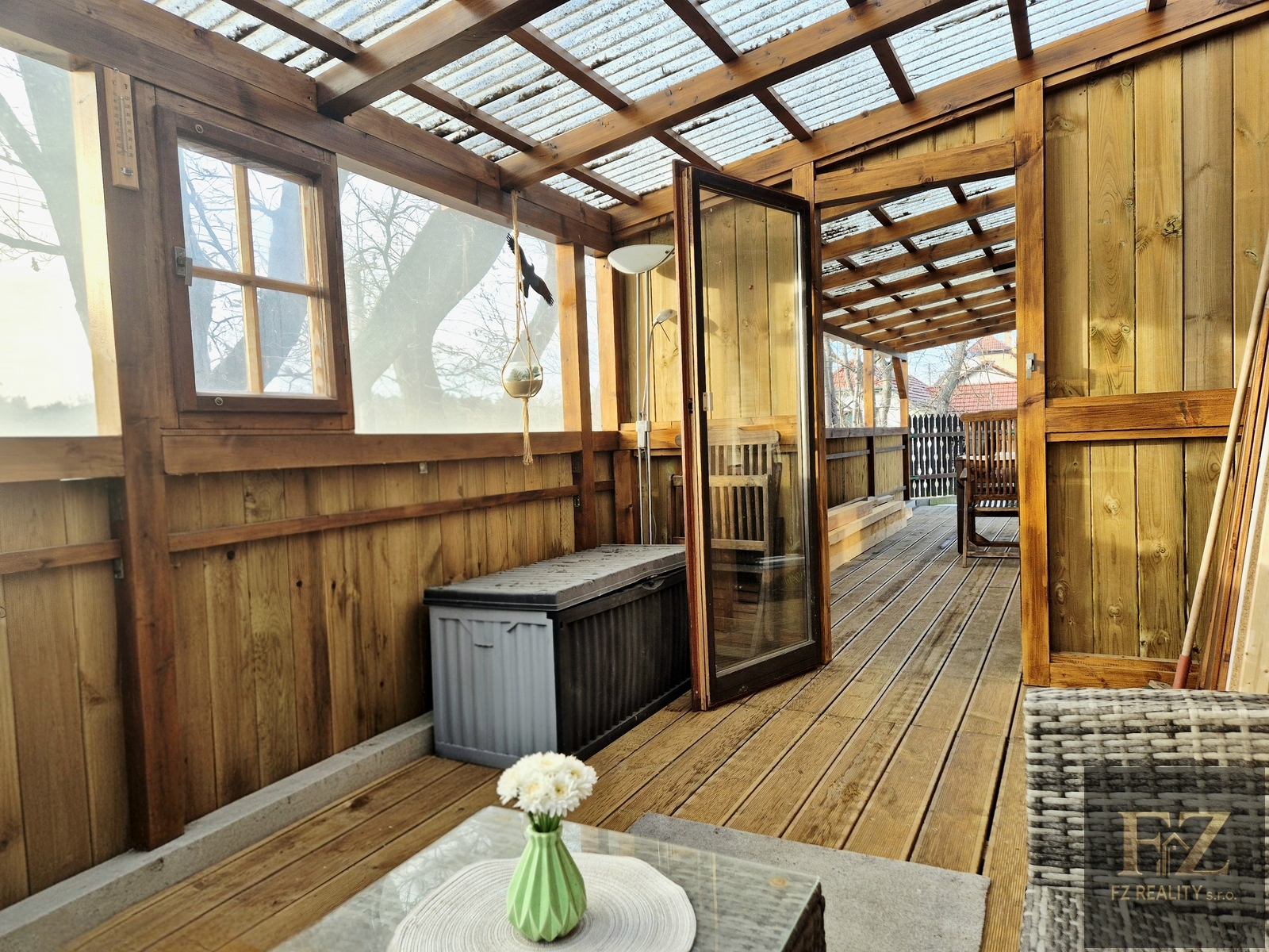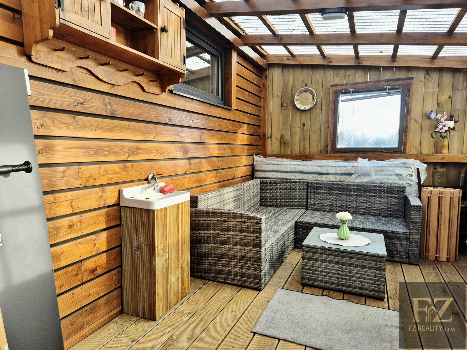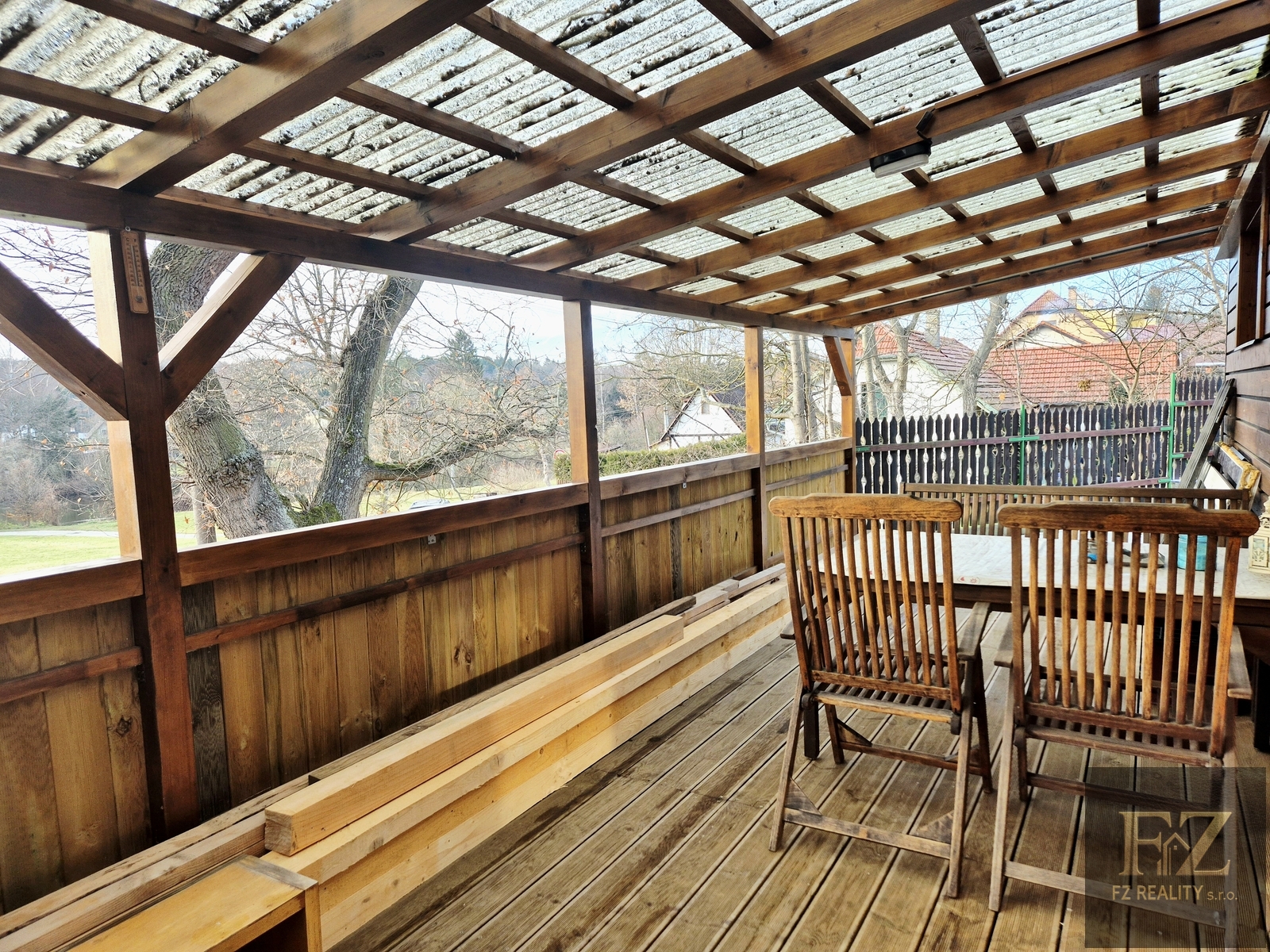 Velkou předností je prostorná terasa rozdělená na dvě části, uzavřenou část (12 m²) vhodnou k posezení i v chladnějším období, zastřešenou otevřenou část (21 m²), obě s pěkným výhledem do zeleně a na řeku Lužnici. Pod terasou se nachází suchý betonový sklep.