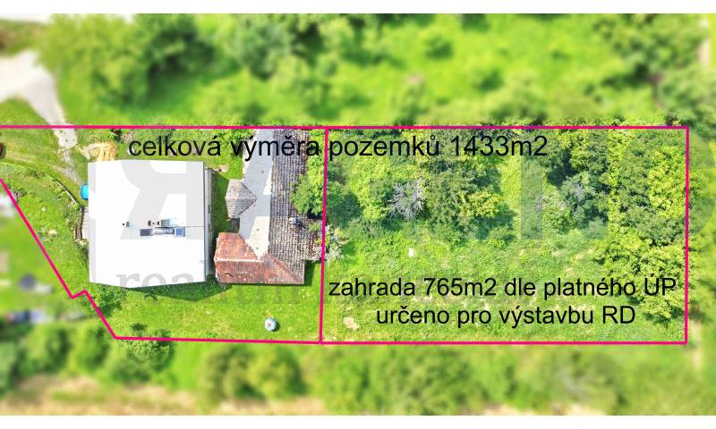 Zahrada o výměře 765m2 je dle platného územního plánu vedena jako plocha smíšená obytná - vesnická, stejně jako ostatní pozemky k domu náležející, tedy určena k výstavbě RD. Pozemek je rovinatý až mírně svažitý a dobře přístupný.