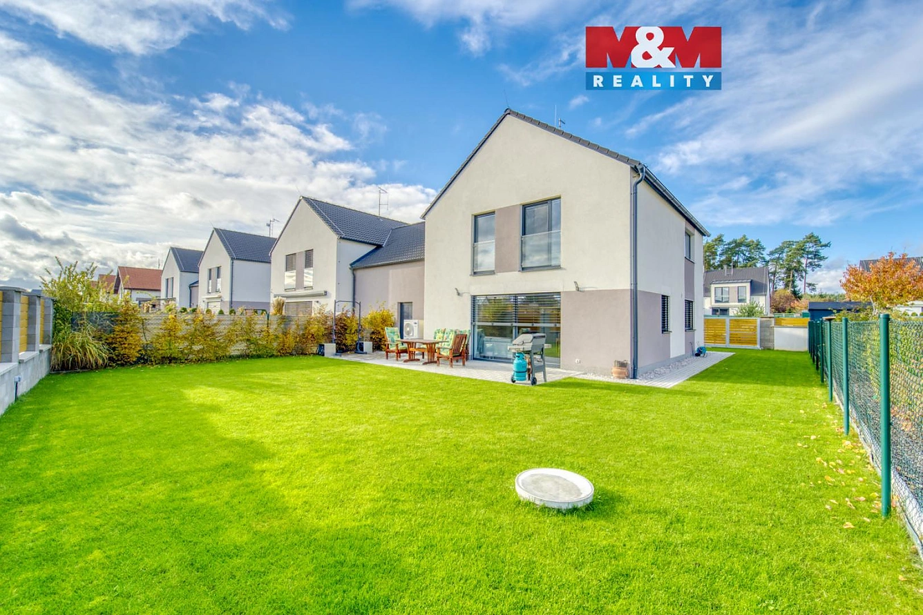Součástí pozemku o rozloze 381 m² je retenční nádrž o objemu 5 m³ se systémem samo zavlažování, což ocení především milovníci zahradničení. Tepelné čerpadlo zajišťuje ekonomické vytápění i ohřev vody a významně tak snižuje provozní náklady. Nemovitost je napojena na veřejnou kanalizaci a vodovod.