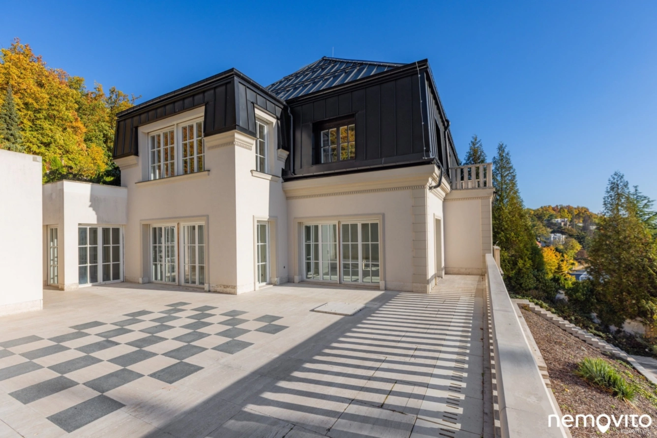 Dům, který netřeba představovat. Monumentální stavba na jedinečném místě, které zajišťuje panoramatický výhled na Černošice a jejich okolní zelené kopce. Stavba, která v době svého vzniku hledala přemožitele jen těžko, je připravena na další etapu své budoucnosti, kterou můžete položit na základě shell&core stavu interiéru.Na pozemku o velikosti 1.966 m2 se nachází dva hlavní objekty. Vila o ploše 743 m2, ke které náleží dalších 201 m2 garáží. A objekt bývalého společenské klubu, který na svých 333 m2 nabízí mimo jiné vnitřní kurt. Komplex, který byl budován na přelomu milénia, byl realizován s neomezeným rozpočtem, což je ostatně zřetelně patrné do dnes.V letech 2022 a 2023 byla na domě vyměněna střecha, byl instalován nový výtah, nová fasáda, došlo k opravám plotů, kompletnímu zajištění domu a výměnám či doplnění chybějících exteriérových prvků. Stavba je připravena k okamžitému dokončení interiérů, které se nyní nachází v hrubé podobě. Ve výchozí podobě (převážně původní) se nachází taktéž zahrada, která je členěna do několika teras, a která v sobě ukrývá mimo jiné venkovní kurt.První podzemní podlaží domu tvoří rozsáhlé garáže se zázemím pro vlastní myčku. Propojení s domem je ikonickým tunelem s výtahem, který byl však vybudován již pro objekt původní vily ze 30. let minulého století. První podlaží domu tvoří převážně relaxační zóna s velkým vnitřním bazénem a spojovací podzemní chodba s druhým objektem. Zbylá podlaží pak tvoří obytnou část budovy, zatímco podkroví je aktuálně nevyužité.Bližší informace poskytuji výhradně na vyžádání. S ohledem na respektování soukromí současného i budoucího majitele zdvořile žádáme o krátké představení vás, ale i vašeho záměru. Anonymní prohlídky objektu nebudou poskytovány. Děkujeme za laskavé pochopení.