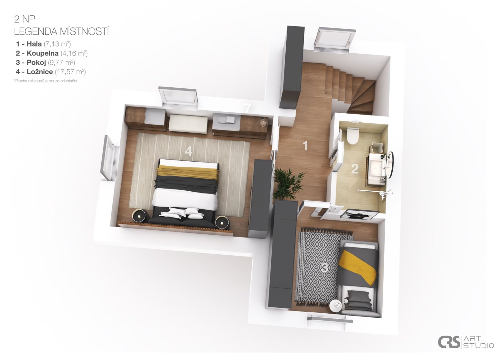 • V patře dvě další ložnice (jedna s klimatizací), koupelna a množství úložných prostor včetně podkroví