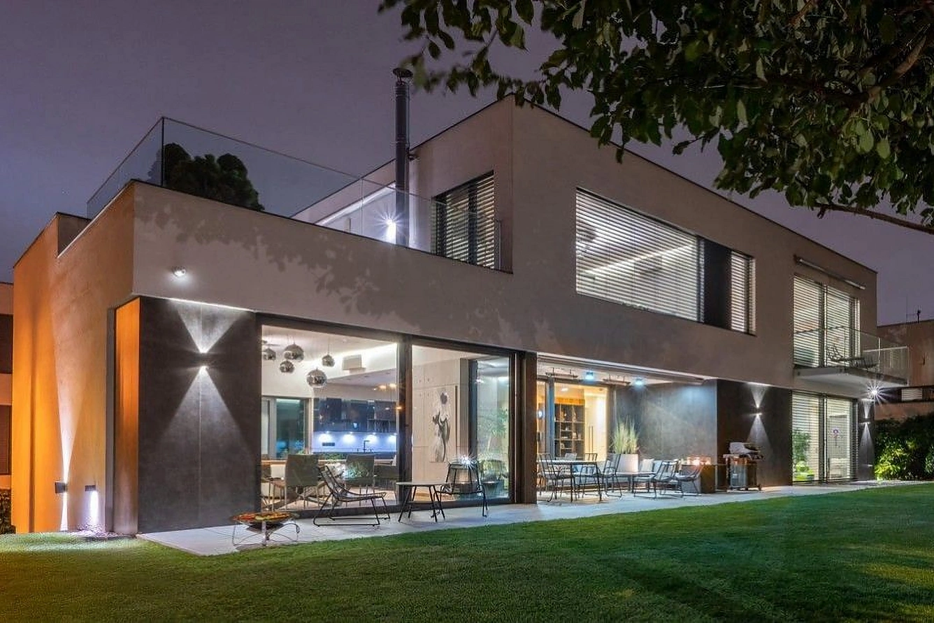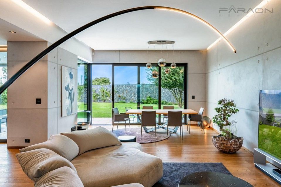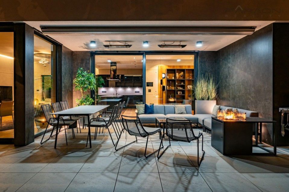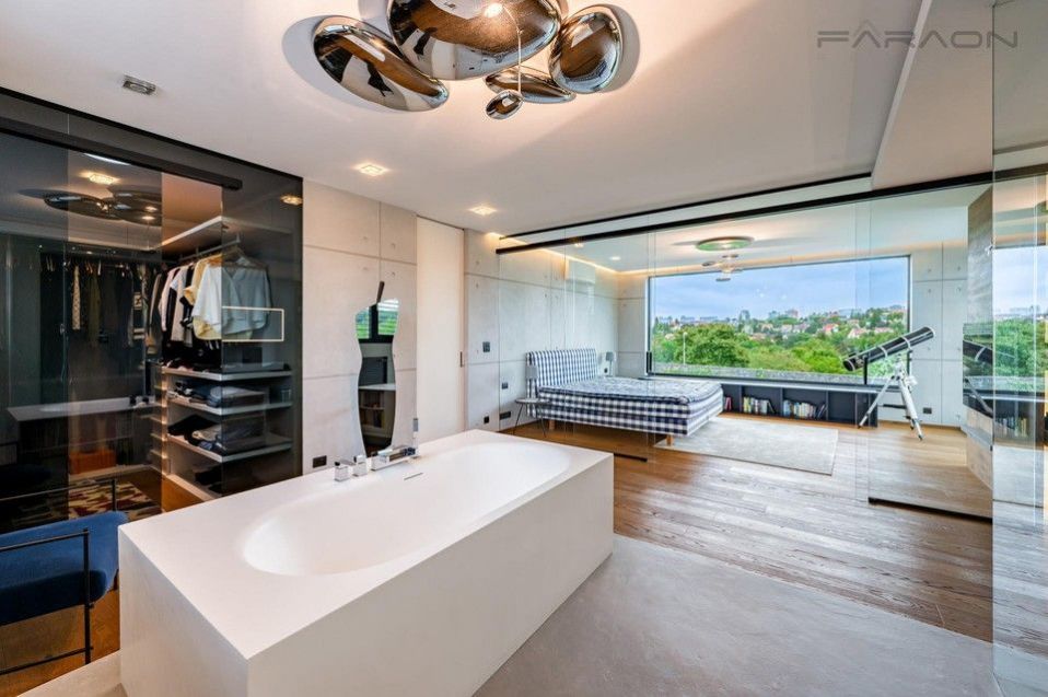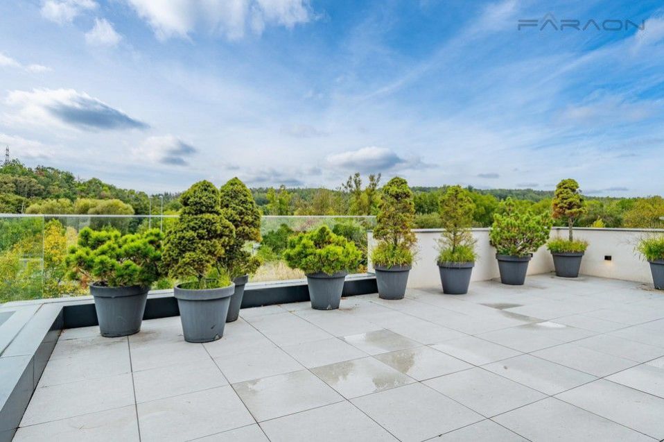 Dispozice domu je promyšlená a poskytuje komfortní prostor pro náročné. Dům je rozložen do tří podlaží, elegantně propojených designovým osvětleným schodištěm. Na dvou nadzemních podlažích se nacházejí tři ložnice, z nichž master ložnice tvoří exkluzivní privátní prostor s koupelnou s prostorovou vanou, sprchovým koutem a šatnou. Další dvě ložnice mají každá vlastní koupelnu a šatnu, což zajišťuje maximální soukromí pro všechny členy rodiny. Vstupní podlaží tvoří srdce domu reprezentativní otevřený koncept obývacího pokoje s jídelnou a kuchyní s přímým vstupem na prostornou terasu vybavenou letním posezením s vyhříváním, ideální pro užívání i během chladnějších měsíců. Terasu obklopuje pečlivě udržovaná zahrada s automatickou závlahou.