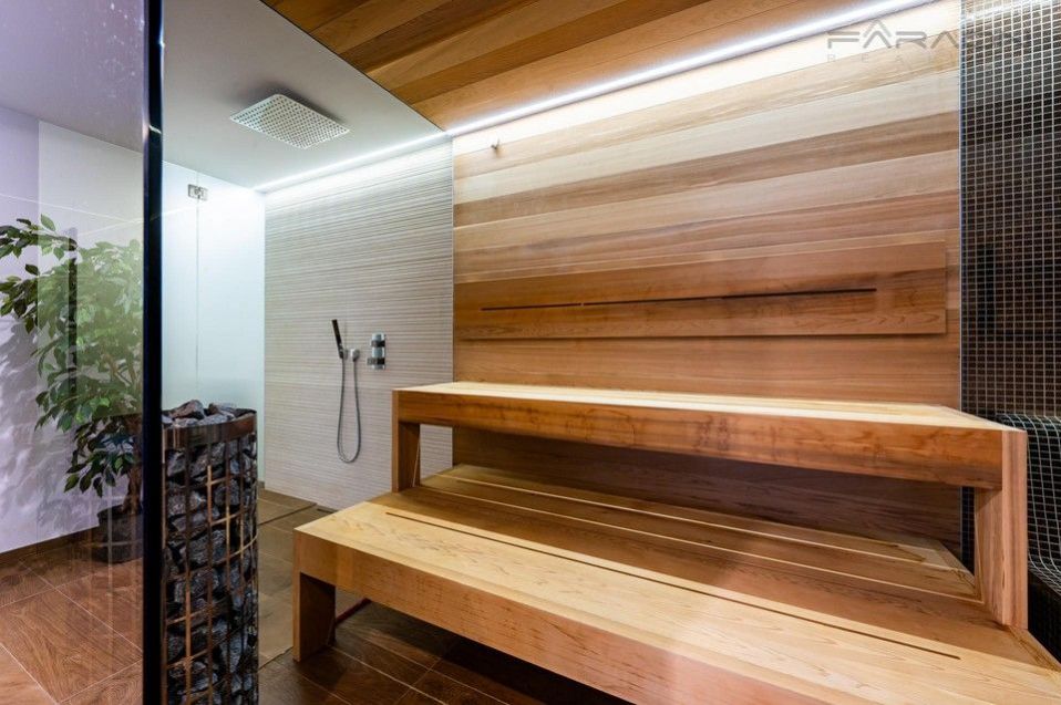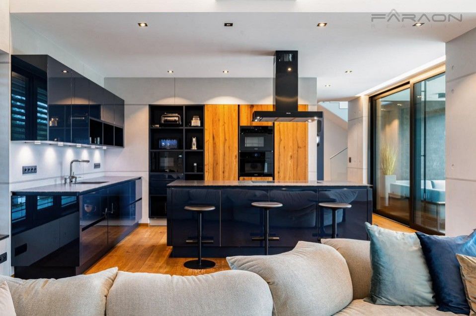 V -1 podlaží se nachází luxusní SPA zóna s vyhřívaným bazénem s protiproudem a podvodní roletou, technologií aktivního kyslíku bez chlóru, finskou a tureckou saunou, relaxační zónou a pokojem pro hosty. Dům dále disponuje garáží pro dva vozy a motocykl, technickou místností s prádelnou a kompletním moderním zázemím. Vybavení a technologie zahrnují tepelná čerpadla Mitsubishi vodavzduch pro ohřev vody i bazénu, klimatizaci Daikin, podlahové vytápění v celém domě, solární elektrárnu s výkonem 8,8 kW a inteligentní systém řízení domácnosti BTICINO, což zajišťuje vysoký komfort, bezpečí a nízké provozní náklady (cca 7 000 Kč měsíčně). Dům je vybaven centrálním systémem suchého vysávání Electrolux, EZS zabezpečovacím systémem Jablotron, kuchyňskou linkou z masivu kombinovanou s lesklým designem INDIGO BLUE se špičkovými spotřebiči Miele, zabudovanými šatními skříněmi NEXT125, vybraným osvětlením ARTEMIDE, betonovými stěrkami TwinArt a hliníkovými okny s izolačními trojskly, což podtrhuje moderní a luxusní charakter domu. Zahrada je pečlivě udržovaná a vybavená automatickou závlahou Rainbird a automatickou sekačkou Husqvarna, terasa nabízí prostor pro venkovní posezení s vyhříváním vzduchu pro chladné dny.