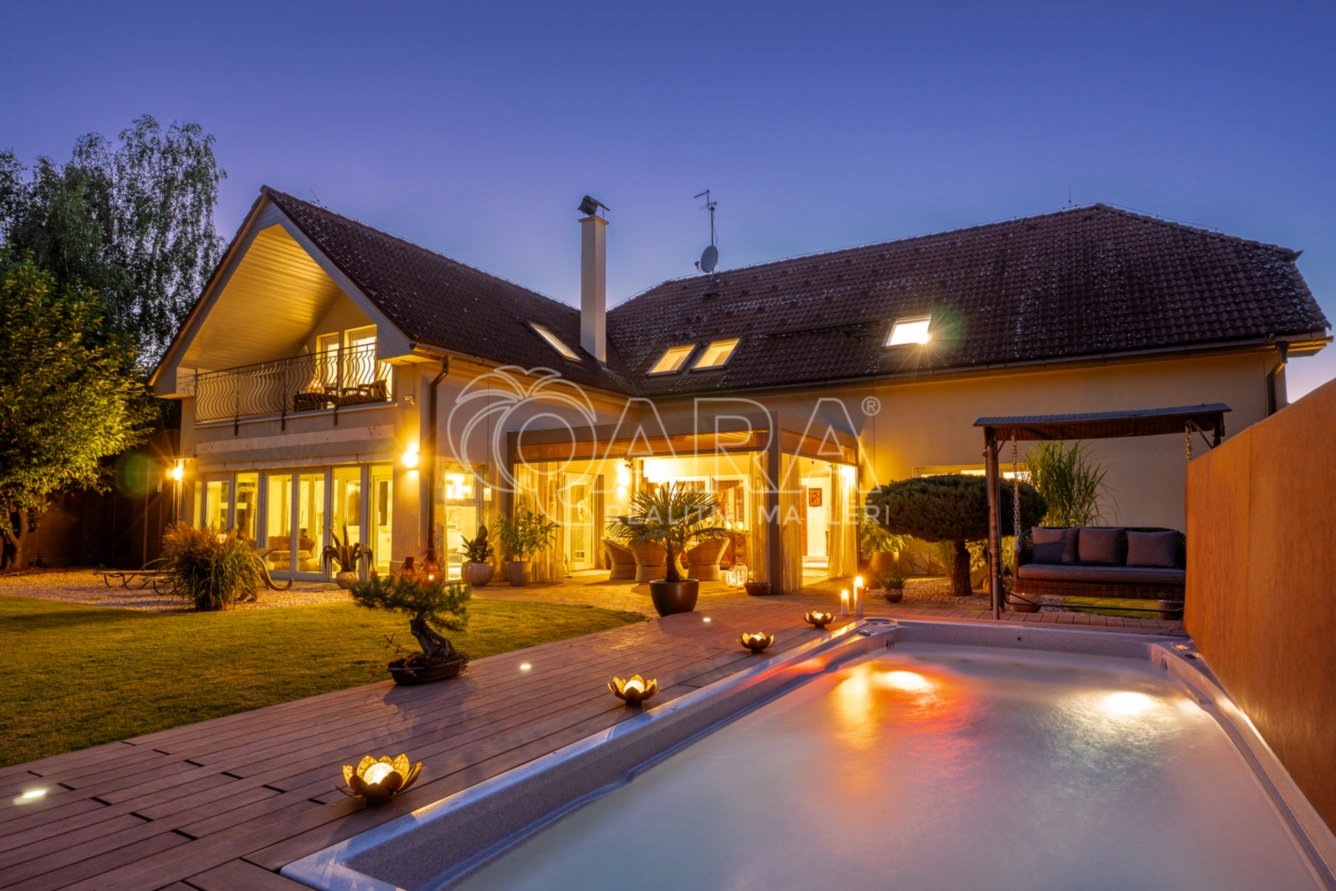 Dům nabízí nadstandardní vybavení, dvě terasy, zimní zahradu, wellness se saunou, profi fitness, plavecké SwimSpa s protiproudem, bioklimatickou pergolu a luxusní kuchyň.