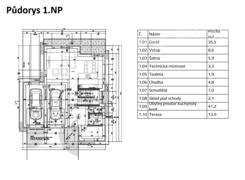 V přízemí se nachází prostorná garáž se dvěma samostatnými vraty, technická místnost, vstupní prostor, šatna, WC (toaleta), sklad, obývací pokoj s kuchyňským koutem a terasa.