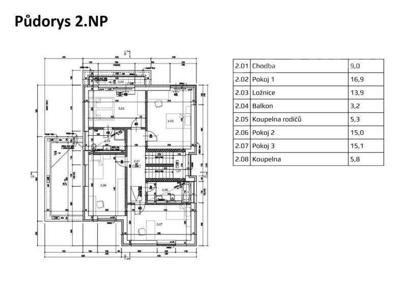 V patře se nachází tři pokoje, ložnice, dvě koupelny a balkon.