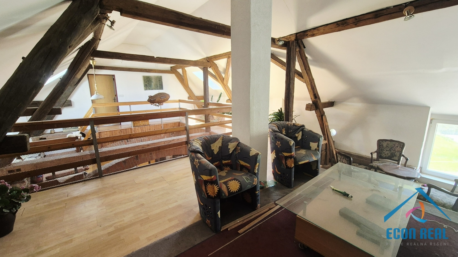 Dřevěné schodiště vede do galerie podkroví, kde jsou další 2 velké pokoje, čtecí a hrací koutek a druhá koupelna s toaletou a sprchou.