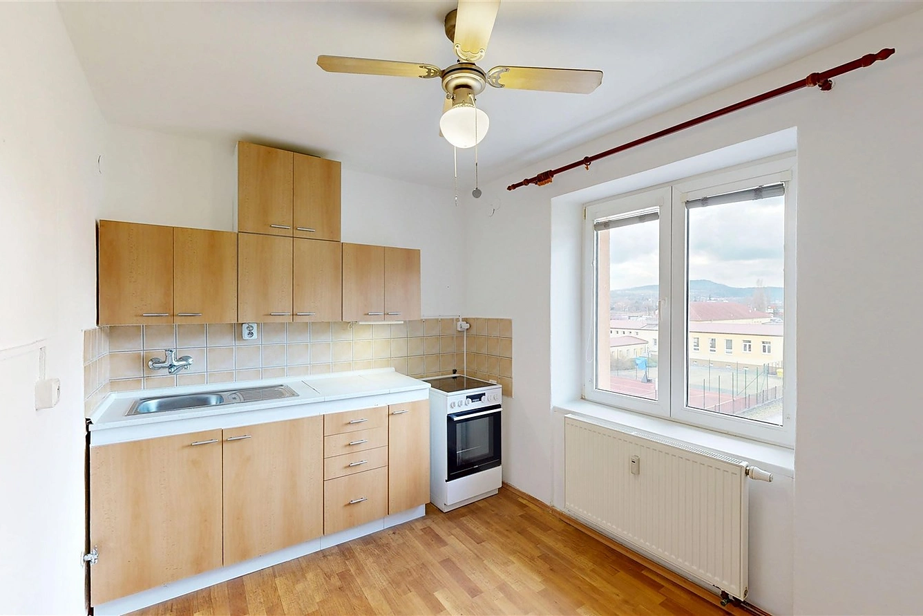 Byt disponuje předsíní, ze které se vchází do koupelny s WC a sprchou, dále pak do obývacího pokoje/ložnice nebo do kuchyně s linkou se sporákem, dřezem a místem pro umístění pračky.
