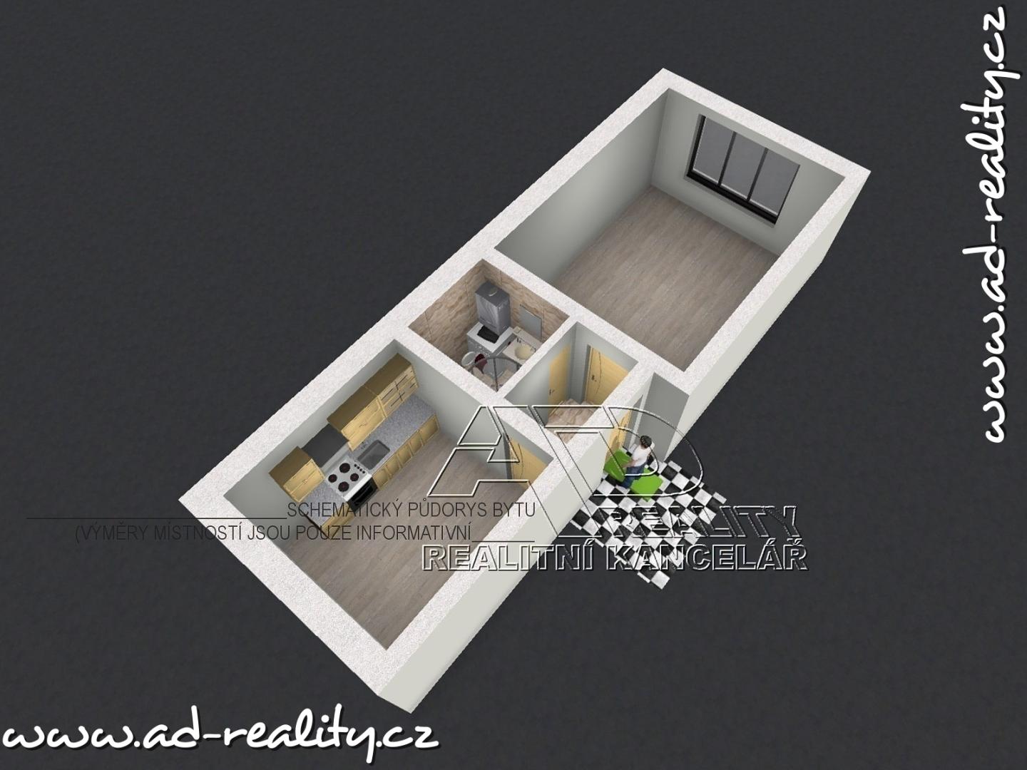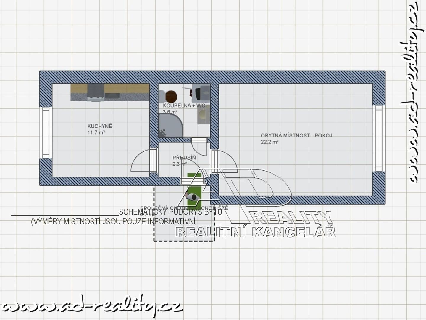 Dispozice: obytná místnost – pokoj [22.3m2], obytná kuchyně [11.8m2], předsíň [2.3m2], koupelna s WC [3.6m2].