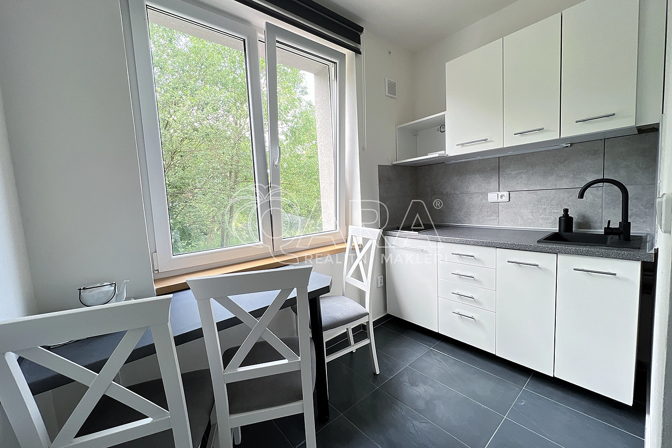 Byt je vybaven moderní kuchyňskou linkou v bílé barvě s granitovým dřezem, černou baterií a dvouplotýnkovou sklokeramickou deskou Amica. V koupelně najdete sprchový kout s černou baterií, závěsné WC Geberit a umyvadlo se skříňkou. V obytné části je laminátová podlaha v šedém odstínu, v kuchyni, chodbě a koupelně pak stylová antracitová dlažba.